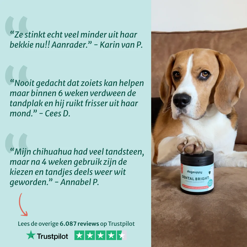 Met Dental Bright geef je jouw hond een stralend schoon gebit en frisse adem. Dit supplement is beoordeeld als het beste hondensupplement van 2024, met duizenden tevreden reviews van hondenbaasjes zoals jij! ๐โจ