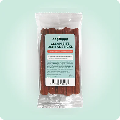 De Clean Bite premium sticks van DogSuppy zijn ontworpen met ribbels die schuren tijdens het kauwen, speciaal op de taaie plekken. Dit verlengt de kauwtijd, wat zorgt voor meer speeksel. Speeksel doodt bacteriΓ«n in de mond van je hond en geeft een frisse adem. Om sterke tanden te bevorderen, voegen we ook calcium toe aan onze dental sticks. Eucalyptus- en pepermuntolie dragen bij aan een frisse adem en maken onze dental sticks extra lekker voor je hond.