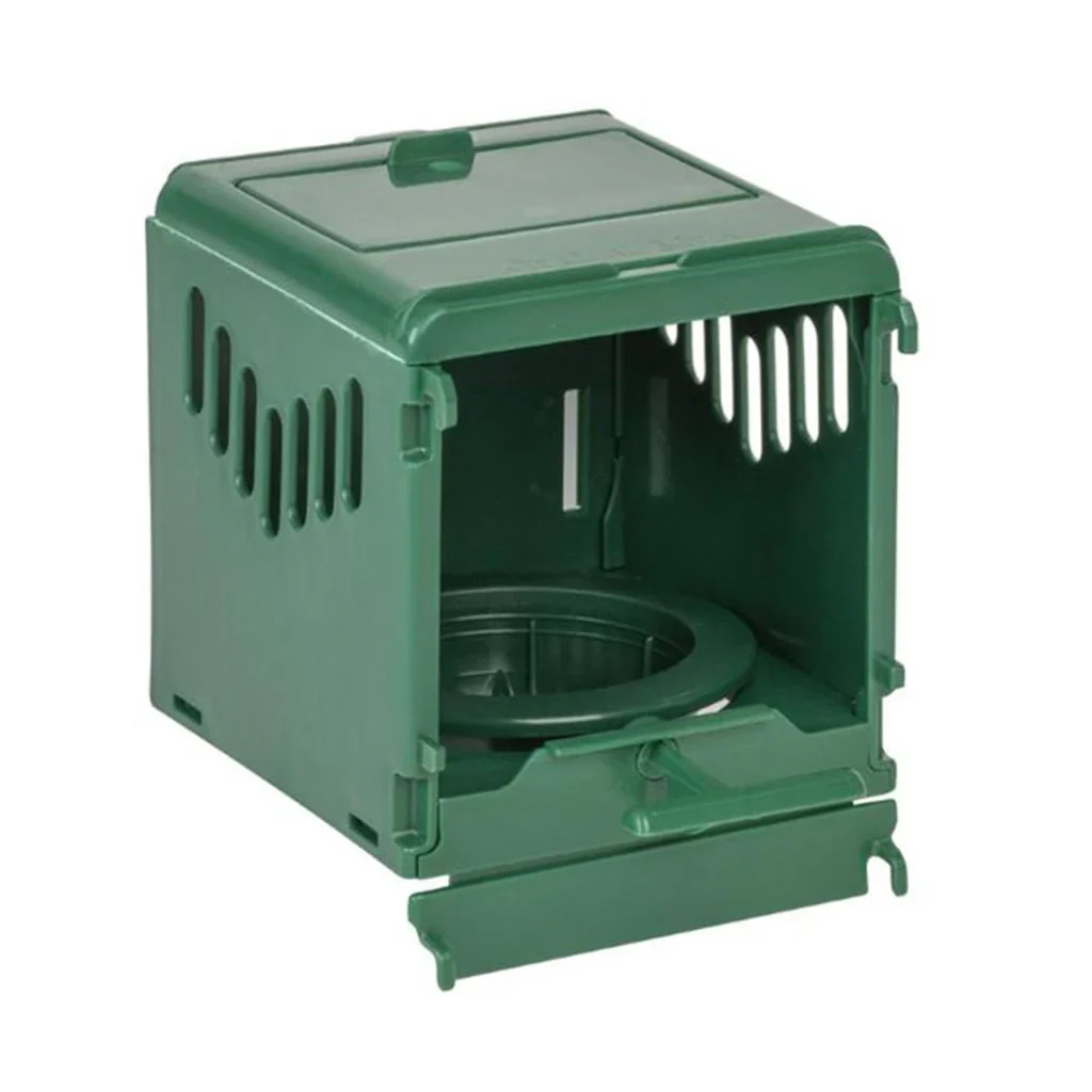 Het betreft een buitennest met aan de bovenkant een lade voor eieren en ringen en het inspectieluikje aan de buitenkant biedt ruimte voor het plaatsen van een controlekaart voor de kweek.