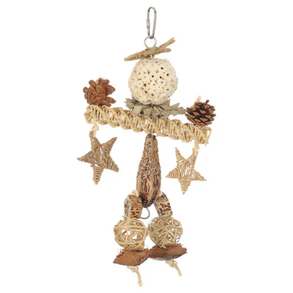 De Adori Twist Man is een fantasierijk vogelspeeltje dat het natuurlijke foerageer- en sloopgedrag van je vogel op een speelse manier stimuleert. Het ontwerp in de vorm van een mensachtig figuur is gemaakt van sola ballen, dennenappels, gevlochten sterren, kokosnootschil en plantaardige vezels. Deze variatie aan materialen en texturen daagt je vogel uit om te klimmen, knagen, trekken en slopen – allemaal activiteiten die bijdragen aan zijn mentale en fysieke welzijn.