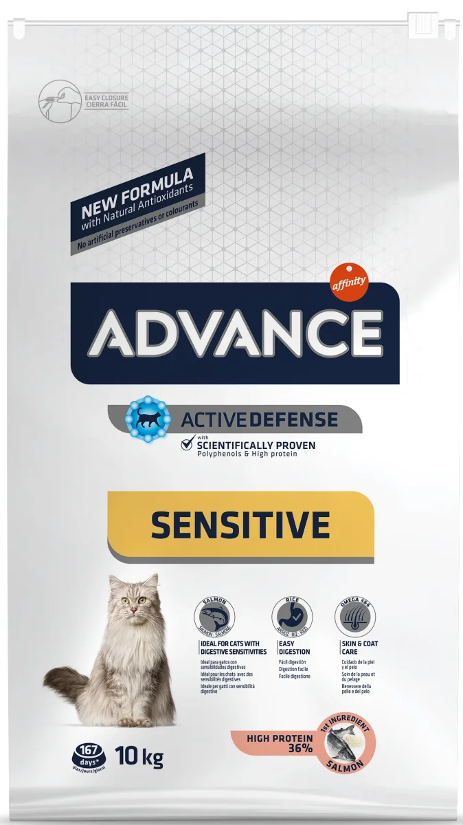 Advance Cat Adult Sensitive Salmon 10 kg is een smakelijk, volledig speciaal kattenvoer gemaakt voor katten met een gevoelige maag of huidproblemen. Veelal hebben katten met maagproblemen klachten aangaande de vertering en de huid. Dit voer haalt eiwit uiteen gemakkelijk verteerbare eiwitbron (zalm), wat samen met rijst een goede spijsvertering ondersteunt. Omega 3 & 6 zorgen bovendien voor een gezonde en glanzende vacht. Daarnaast zijn de brokken zeer smakelijk, voor een goede acceptatie! Volledig voer specifiek geformuleerd voor volwassen katten.