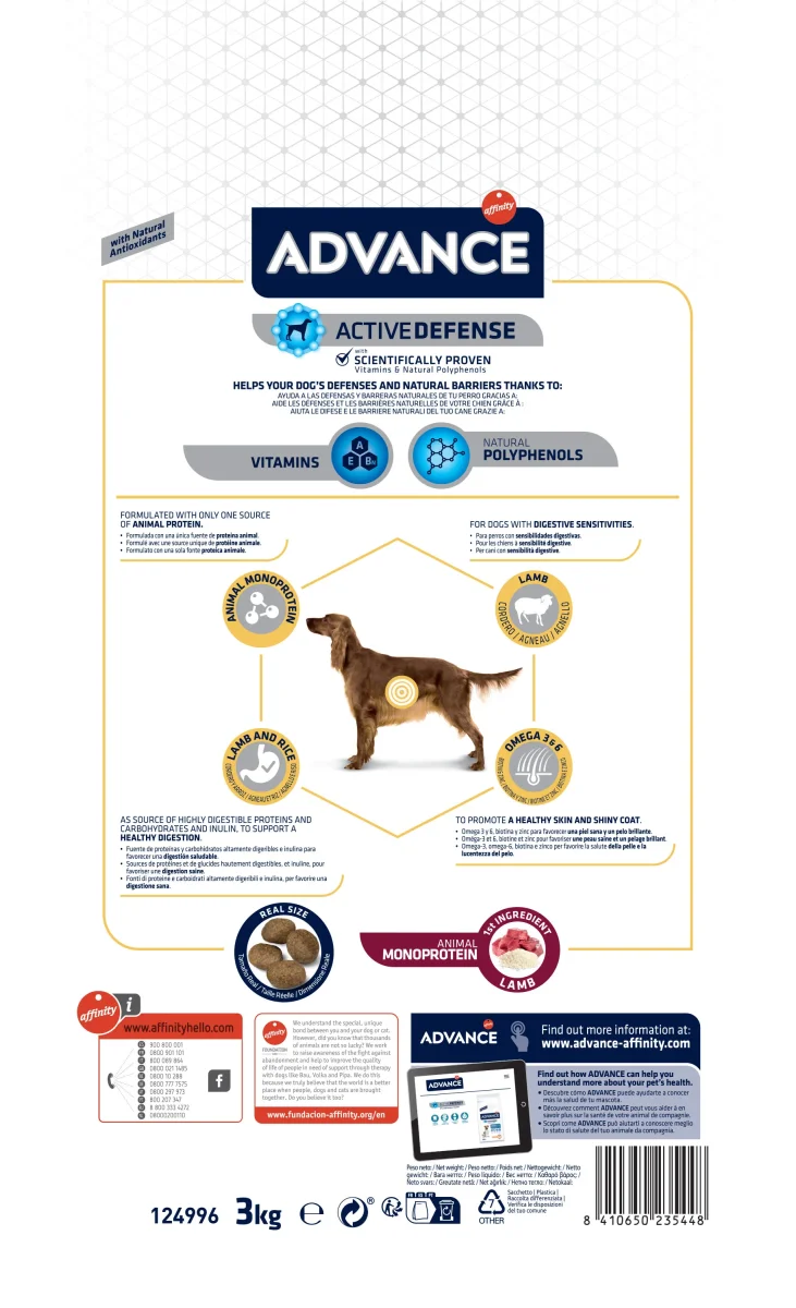 Advance Sensitive Lamb/Rice 3 kg is compleet hondenvoer met lam, speciaal ontwikkeld voor honden met een gevoelige maag of huidproblemen.