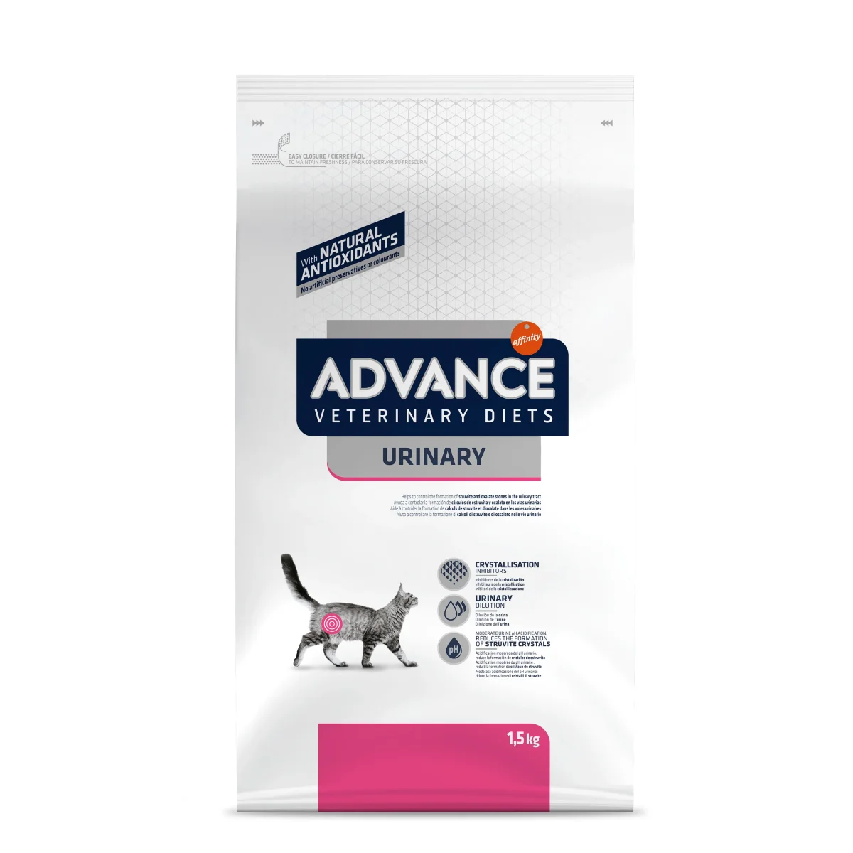 Advance Veterinary Diet Cat Urinary Urinewegen 1,5 kg is een compleet dieetvoer voor volwassen katten. Dit voer wordt aanbevolen om het voorkomen van struviet- en oxalaatstenen in de urine te helpen verminderen vanwege het gematigde magnesiumgehalte en de verzuring van de urine. Daarnaast is het een ideaal compleet en uitgebalanceerd dieet voor de dagelijkse voeding van katten die de neiging hebben om last te hebben van urinewegproblemen.