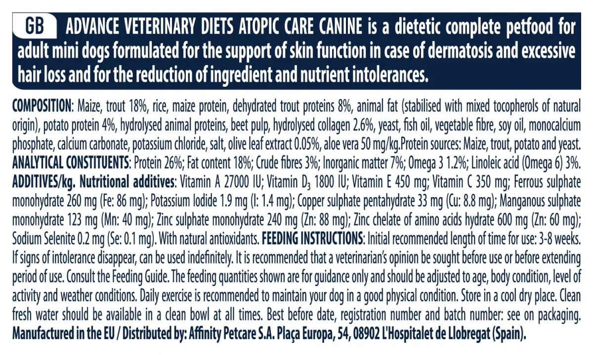 De Advance Veterinary Diet Dog Atopic Mini 1,5 kg is compleet dieetvoer voor kleine volwassen honden en puppy’s vanaf 4 maanden. Deze voeding is speciaal ontwikkeld om de huid te verzorgen bij dermatitis en overmatig haarverlies, en om intoleranties voor bepaalde ingrediënten en voedingsstoffen te verminderen.
