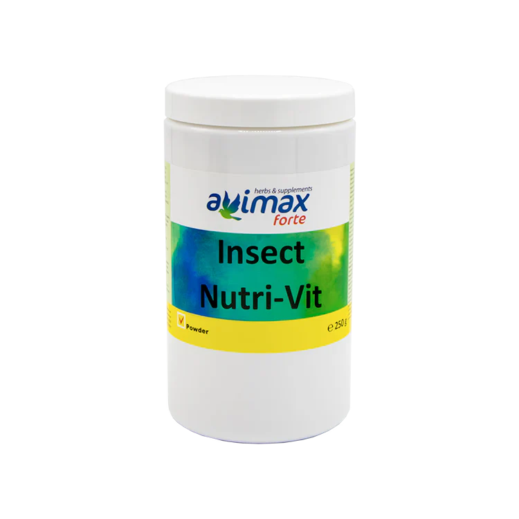 AviMax Forte Insect Nutri-Vit is een strooipoeder voor voederinsecten. Insecten hebben een te laag calcium en Vitamine D3 gehalte, omdat ze geen inwendig skelet hebben. Calcium en Vitamine D3 tekorten kunnen bij vogels voorkomen worden door de insecten te bepoederen met Insect Nutri-Vit.