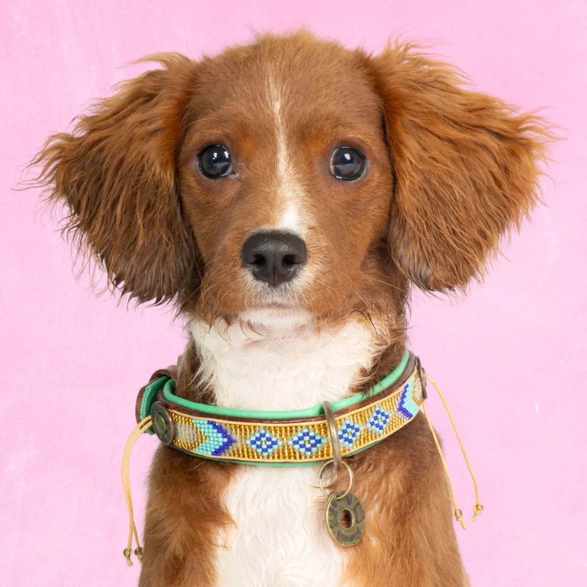 De Indi Moon halsband is een echte blikvanger met haar verfijnde kralenpatroon en bohemian uitstraling. Deze handgemaakte halsband in maat XS (halsomvang 25-29 cm, breedte 2 cm) is gemaakt van bruin buffelleer met een turquoise leren voering aan de binnenkant. De halsband heeft handgeregen kralen in goud en turquoise. De combinatie van bruin en turquoise leer met de kleurrijke handgemaakte kralen maakt deze halsband een echte eyecatcher. Perfect voor kleine honden die opvallen met een vrolijke, bohemian look.