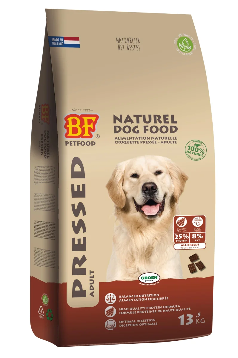 BF Petfood (voorheen Biofood) geperst adult is een volledige, natuurlijke en zeer smaakvolle geperste hondenvoeding die geschikt is voor alle hondenrassen. Deze koud geperste BF Petfood brok bevat hoogwaardige natuurlijke grondstoffen en de optimale dagelijkse hoeveelheid eiwitten, vetten, koolhydraten, vitaminen en mineralen die bijdragen tot een goede gezondheid van jouw hond. Bij de bereiding wordt gebruik gemaakt van rund, kip en wild zwijn.