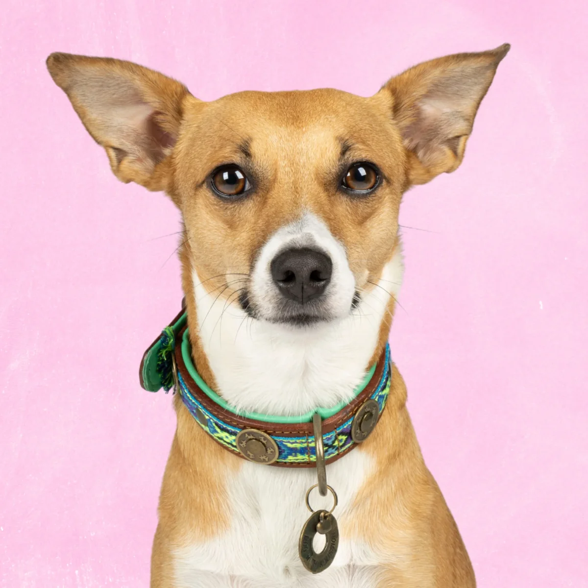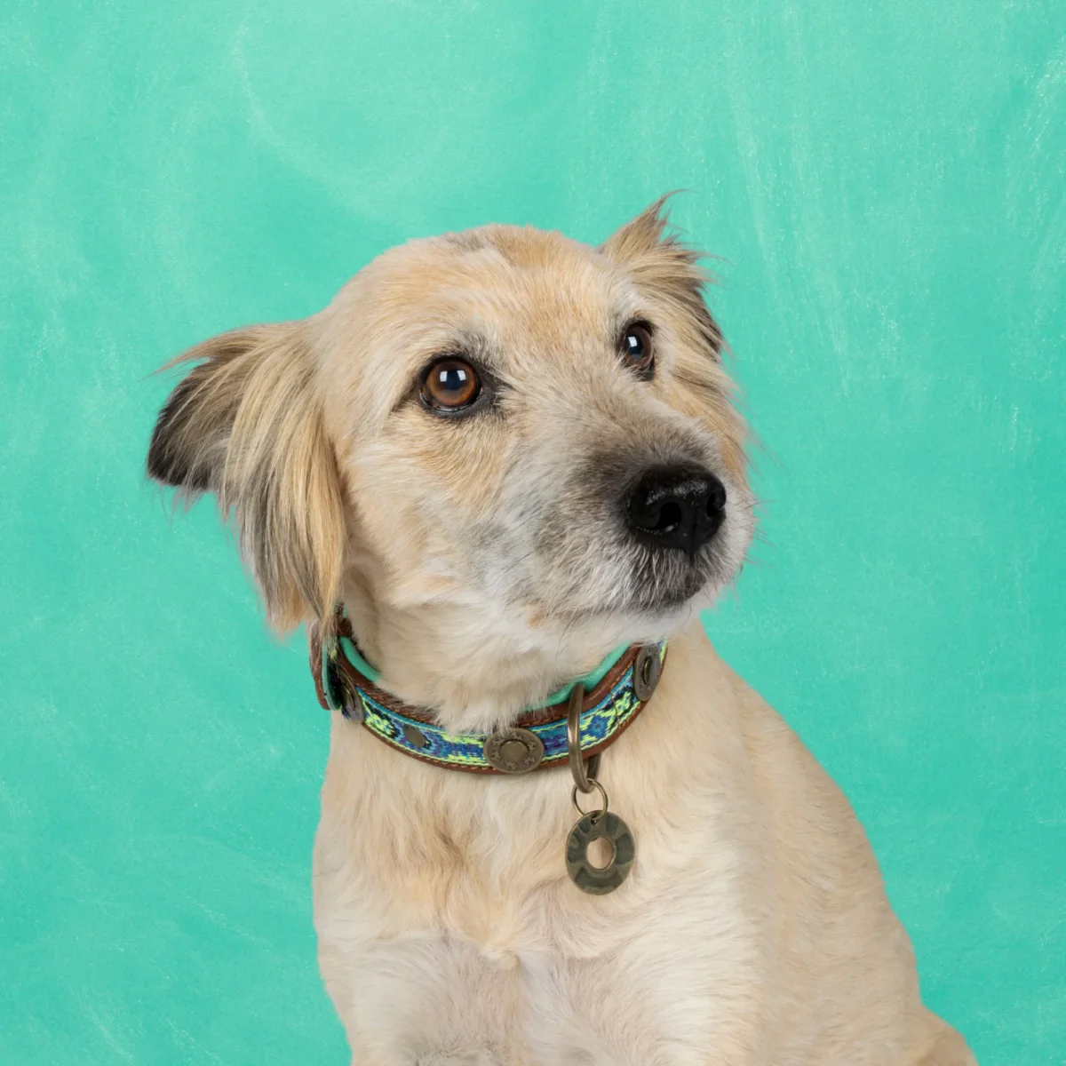 De Boho Juan halsband heeft een uitgesproken bohemian stijl en geeft elke hond meteen een avontuurlijke look. Deze handgemaakte halsband in maat S (halsomvang 30-33 cm, breedte 2,5 cm) is gemaakt van bruin buffelleer met een turquoise leren voering aan de binnenkant. Over het bruine leer loopt een decoratieve blauwe boho band die de halsband een speelse, bohemian uitstraling geeft. De combinatie van bruin en turquoise leer met de opvallende blauwe boho band maakt deze halsband een echte eyecatcher. Perfect voor kleine honden die opvallen met een vrolijke, bohemian look.