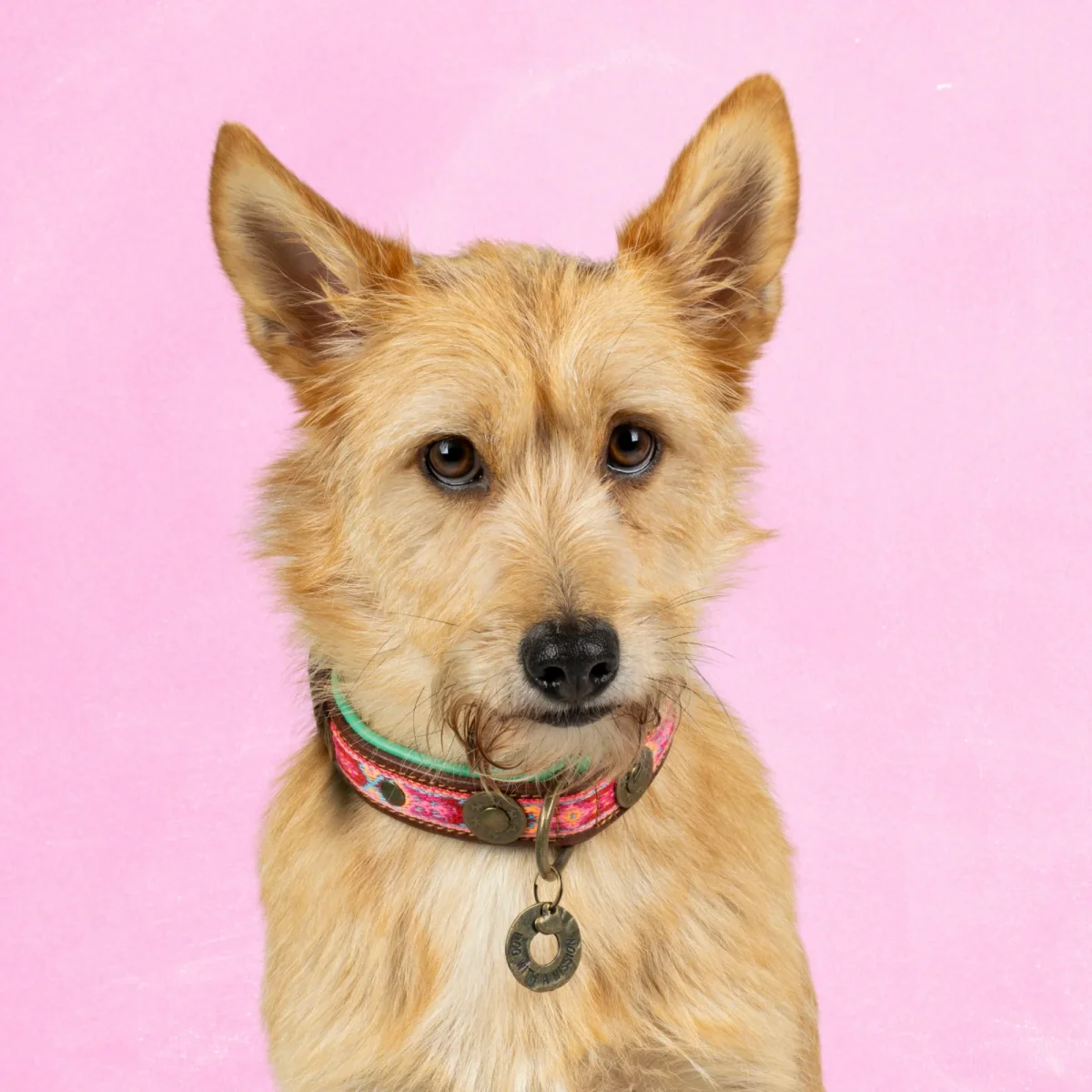 De Boho Rosa halsband springt meteen in het oog met haar rijke geweven patroon en uitgesproken bohemian stijl. Deze handgemaakte halsband in maat S (halsomvang 30-33 cm, breedte 2,5 cm) is gemaakt van bruin buffelleer met een turquoise leren voering aan de binnenkant. Over het bruine leer loopt een decoratieve roze boho band die de halsband een speelse, bohemian uitstraling geeft. De combinatie van bruin en turquoise leer met de opvallende roze boho band maakt deze halsband een echte eyecatcher. Perfect voor kleine honden die opvallen met een vrolijke, bohemian look.