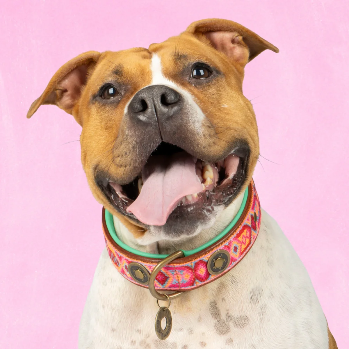 Halsomvang: 48-57 cm (XL) | Breedte: 4 cm | Materiaal: Buffelleer met leren voering | Kleur: Bruin leer met turquoise voering en roze boho band | Hardware: Messing | Handgemaakt