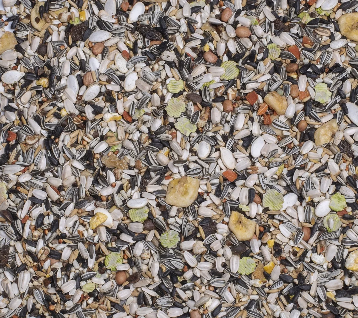 Deze mengeling bevat waarschijnlijk een mix van hoogwaardige zaden, noten, gedroogd fruit en mogelijk extra eiwit- en vetrijke ingrediënten die het dieet van deze vogels verrijken en ondersteunen.