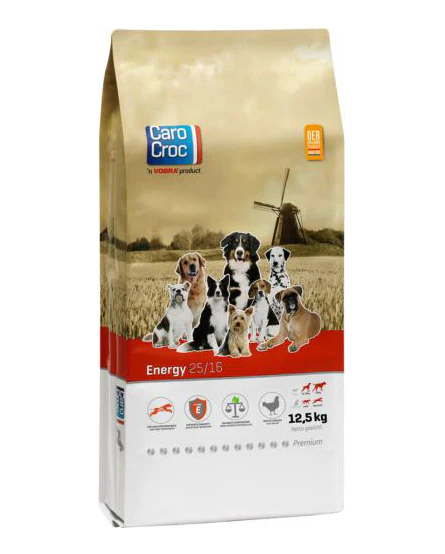 De CaroCroc Energy 25/16 12,5 kg is volledig geëxpandeerde hoogenergie voeding in brokken voor volwassen honden met zware inspanning. Unieke samenstelling van vlees, vetten en granen. Deze streng geselecteerde grondstoffen, aangevuld met vitamines, sporenelementen en mineralen in de juiste verhouding, zorgen dat honden met zware inspanning steeds in topconditie blijven. Carocroc 25/16 is een “premium” voer voor politie-, bewakings-, ren- en sledehonden, drachtige en zogende teven, dekreuen, alsmede alle honden welke in topconditie moeten blijven, ondanks zware prestaties. Carocroc 25/16 bevat extra Omega 3 en 6. Carocroc 25/16 is smakelijk en bevat geen kunstmatige toevoegingen.