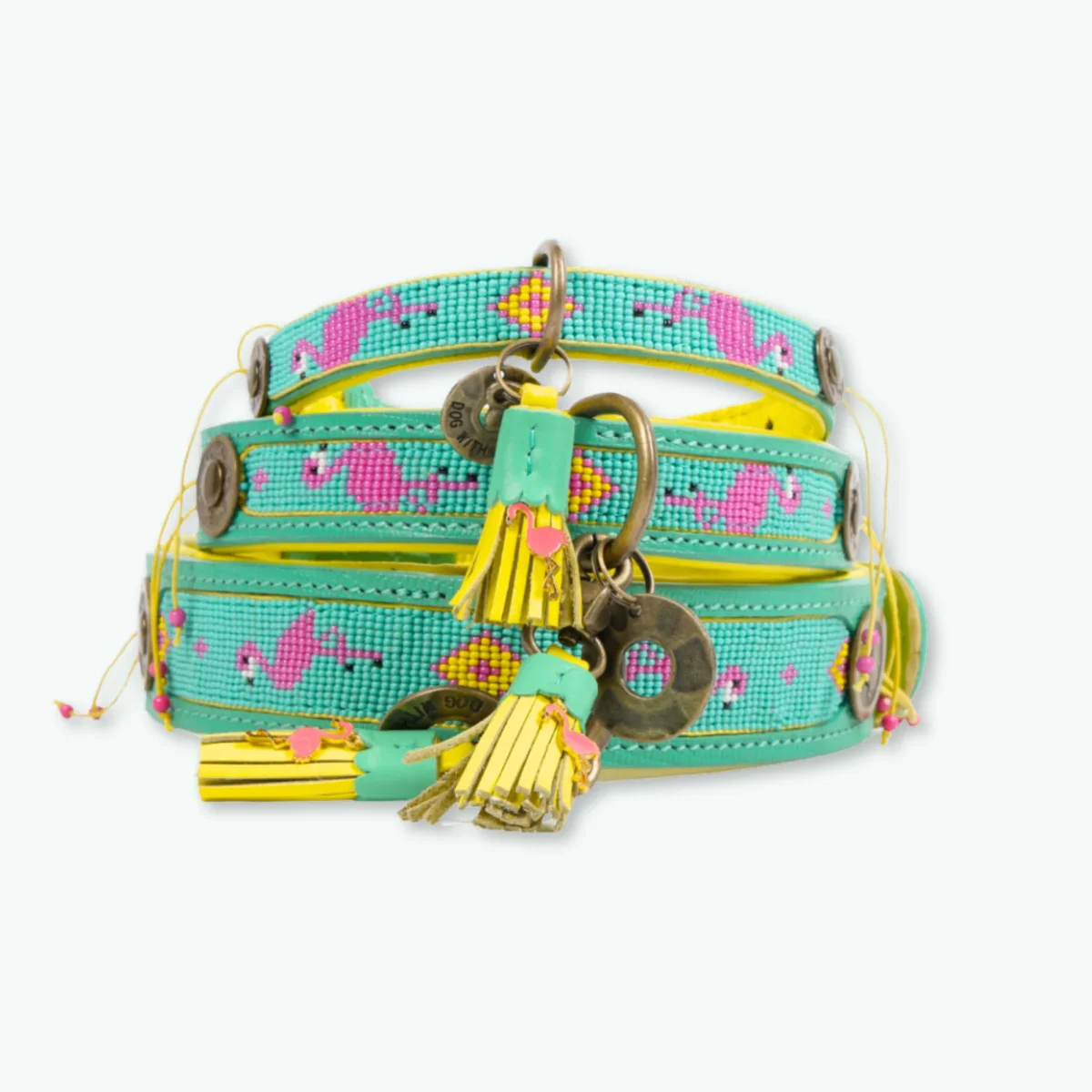 Halsomvang: 22-24 cm (XXS) | Breedte: 2 cm | Materiaal: Buffelleer | Kleur: Turquoise leer met flamingo kralendesign in roze en geel | Hardware: Messing | Handgemaakt