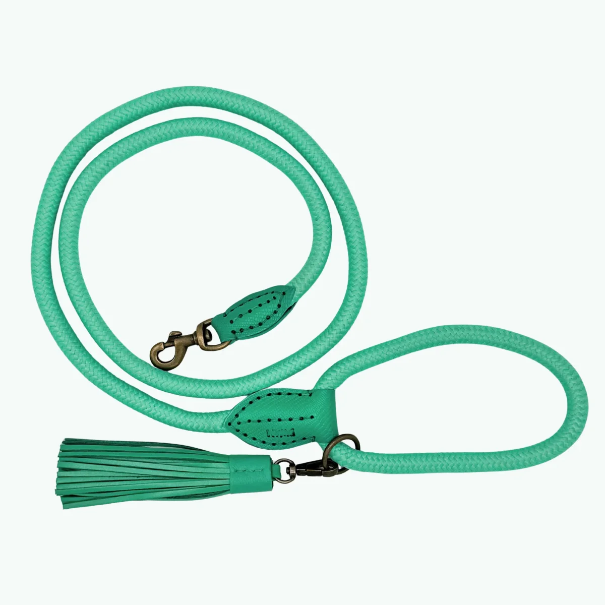 De Classic Lagoon is de riem die overal bij past en toch altijd opvalt. Stevig gevlochten touw, leren manchetten, een speelse kwast en antiek messing hardware. Handgemaakt voor honden die elke wandeling in stijl aftrappen.