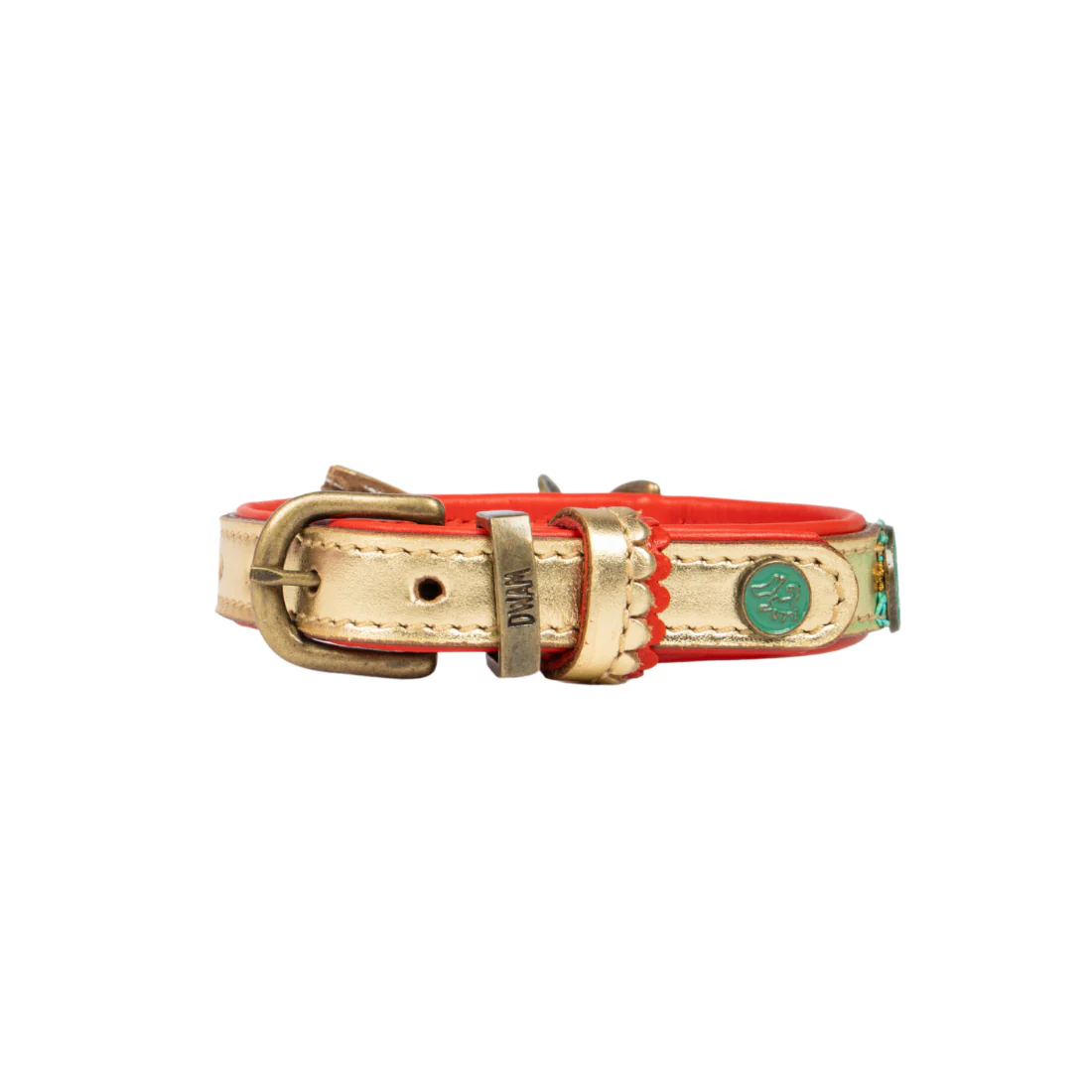Halsomvang: 25-29 cm (XS) | Breedte: 2 cm | Materiaal: Buffelleer met leren voering | Kleur: Goudkleurig leer met rood binnenleer en turquoise band | Hardware: Messing | Handgemaakt