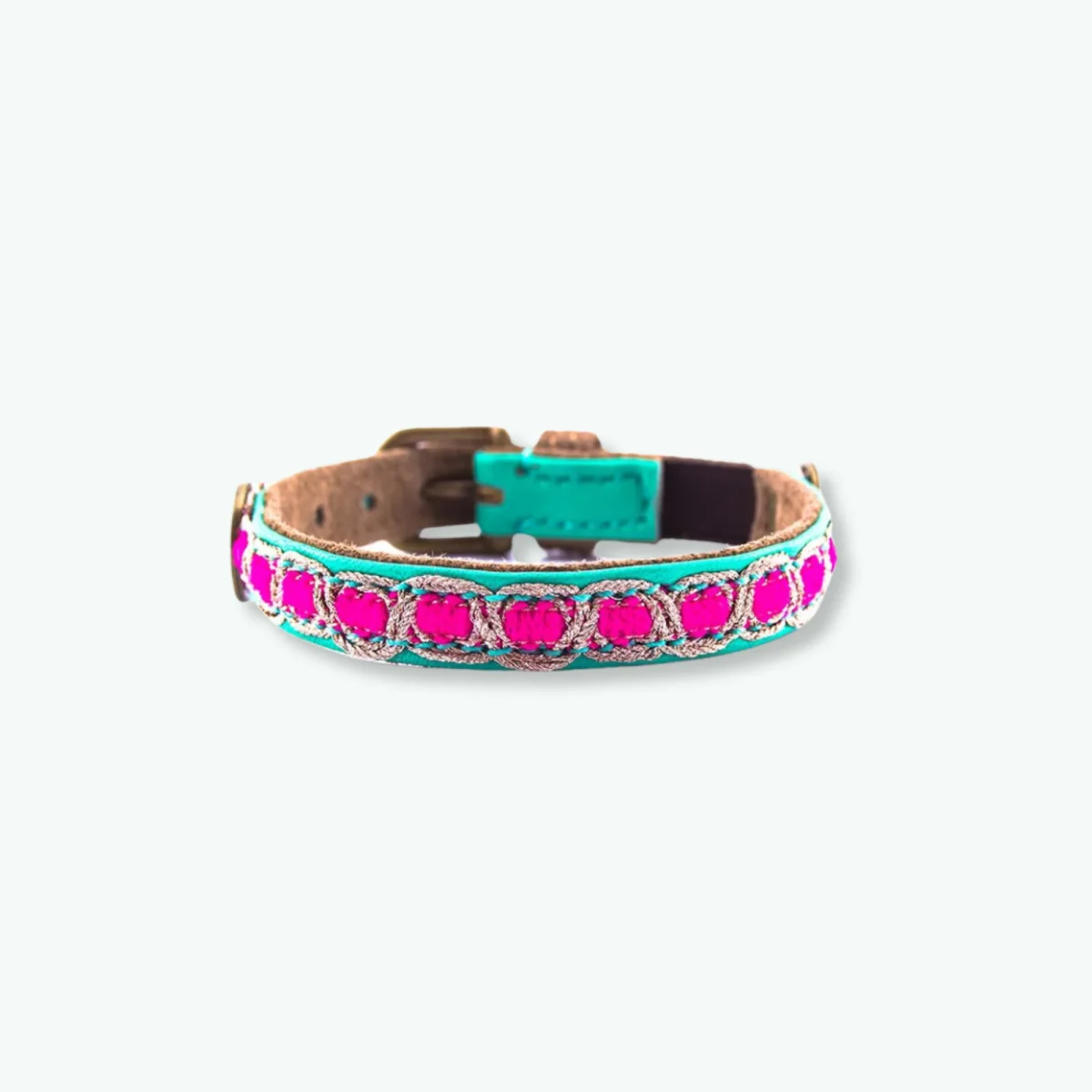 De Coco is een mooi leren halsbandje voor je kat met handgemaakte afwerking. Bruin en roze gecombineerd met onze unieke DWAM turquoise, deze halsband past bij elke kat. Complimenten uit de wijk gegarandeerd, andere katten zullen jaloers zijn.