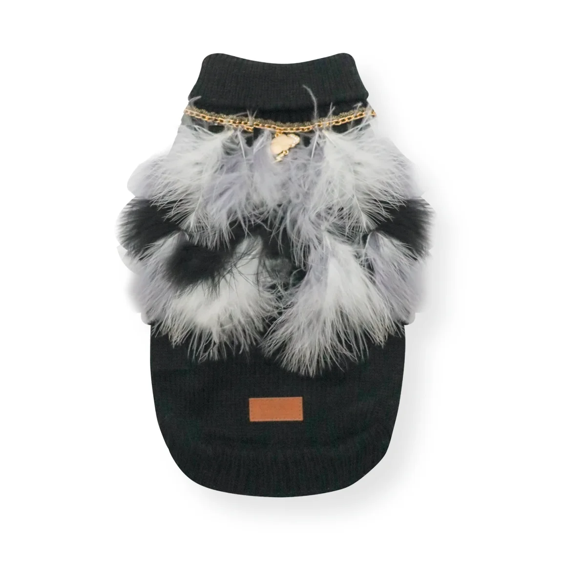 De Croci Hondentrui Met Veren Zwart/Wit 25 cm combineert stijl en functionaliteit. Het mooie ontwerp zorgt ervoor dat je hond er trendy uitziet, terwijl de trui hem warm houdt. Met een handige opening om aan te lijnen kun je gemakkelijk een lijn bevestigen voor een wandeling. De lussen voor de achterpoten zorgen ervoor dat de trui goed op zijn plaats blijft, zelfs tijdens het spelen of rennen.