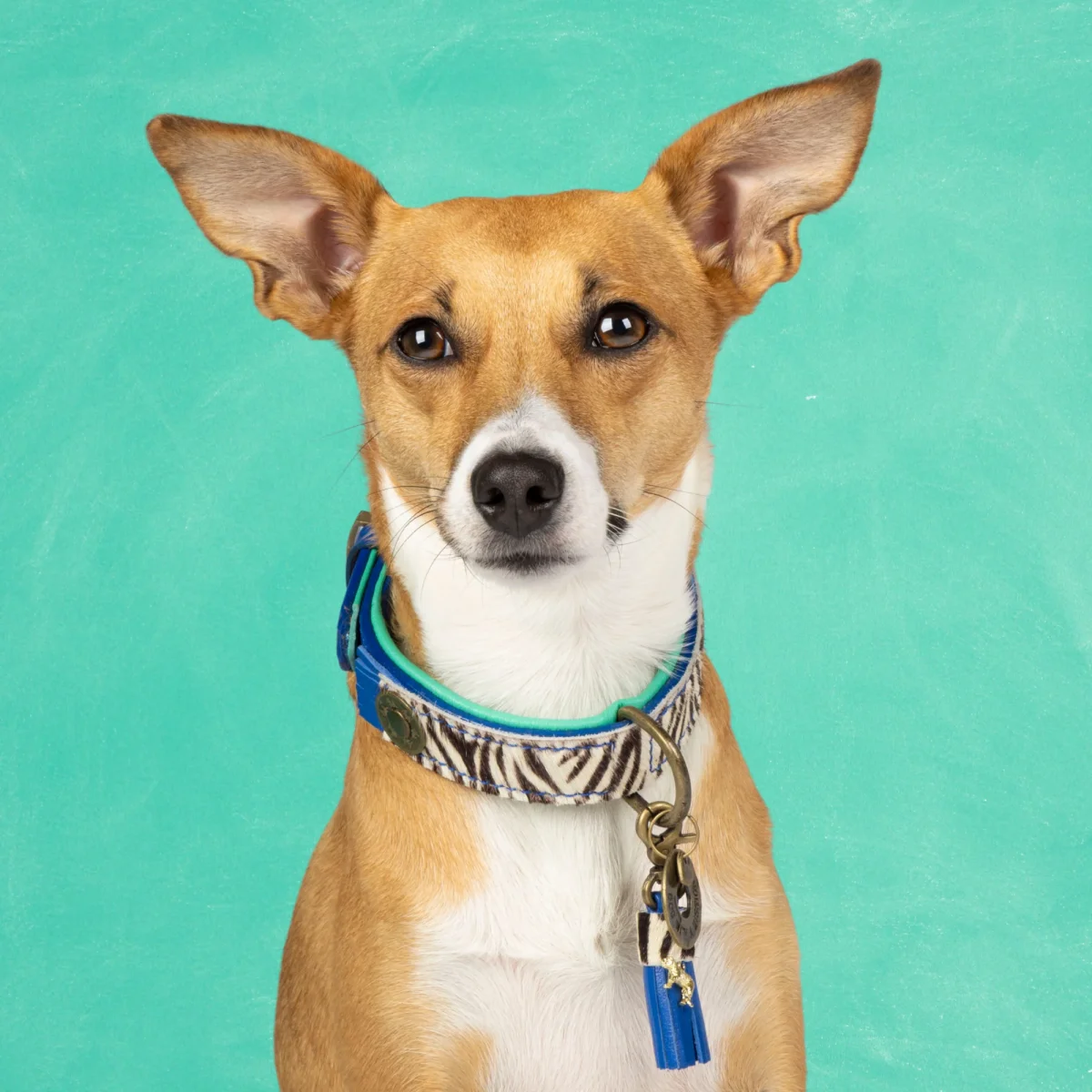 Halsomvang: 30-33 cm (S) | Breedte: 2,5 cm | Materiaal: Buffelleer met leren voering | Kleur: Blauw leer met turquoise voering en zwart-wit zebradesign | Hardware: Messing | Handgemaakt