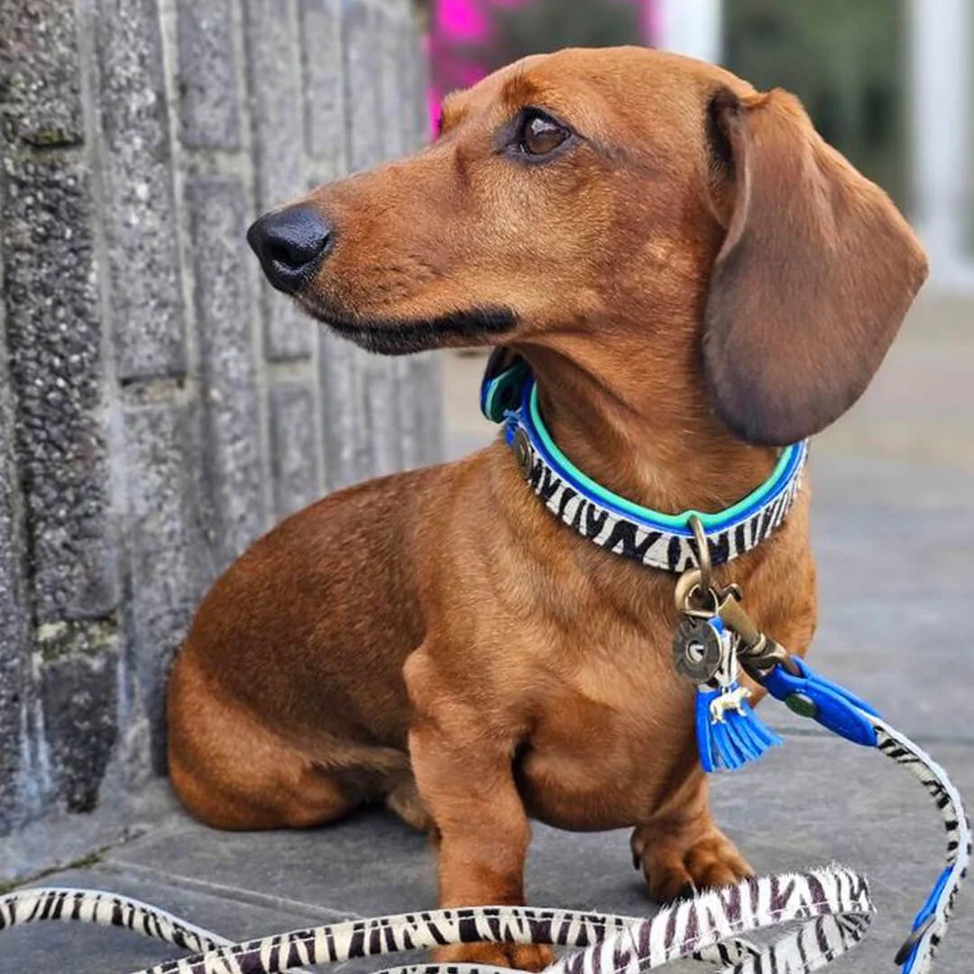 De Dandy halsband brengt een perfecte mix van luxe en lef met haar kenmerkende zebraprint. Deze handgemaakte halsband in maat S (halsomvang 30-33 cm, breedte 2,5 cm) is gemaakt van blauw buffelleer met een turquoise leren voering aan de binnenkant. De halsband heeft een opvallend zwart-wit zebradesign. De combinatie van blauw leer, turquoise voering en het chique zebradesign maakt deze halsband een echte eyecatcher. Perfect voor kleine honden die opvallen met een stijlvolle, chique look.