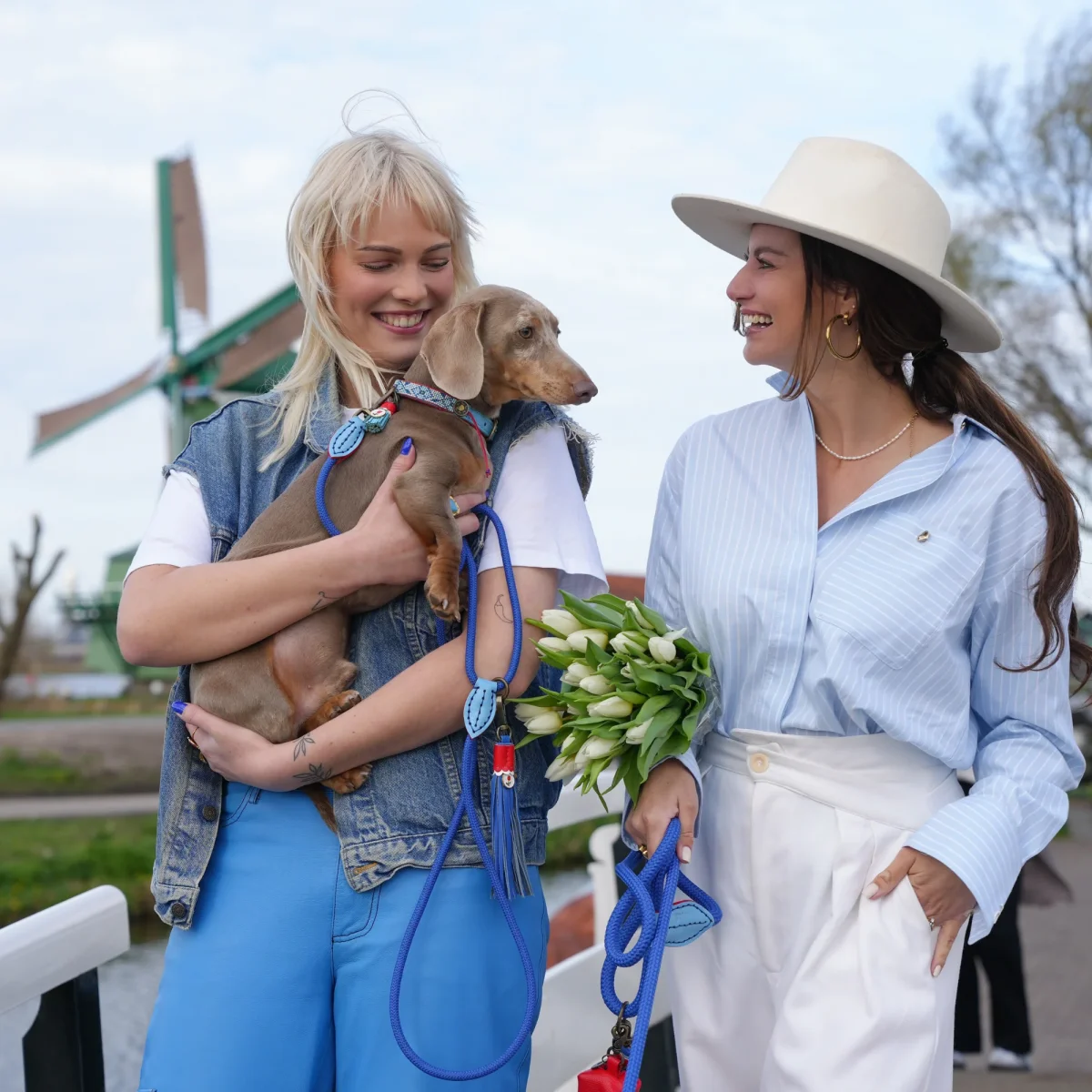 De Dutchie halsband straalt hollandse charme uit met een speelse en moderne afwerking. Deze handgemaakte halsband in maat XS (halsomvang 25-29 cm, breedte 2 cm) is gemaakt van blauw buffelleer met een rode leren voering aan de binnenkant. De halsband heeft een blauw-wit kralendesign en een kwastje met tulp. De combinatie van blauw en rood leer met het blauw-witte kralendesign en tulpkwastje maakt deze halsband een echte eyecatcher in rood-wit-blauw. Perfect voor kleine honden die opvallen met een vrolijke, Nederlandse look.
