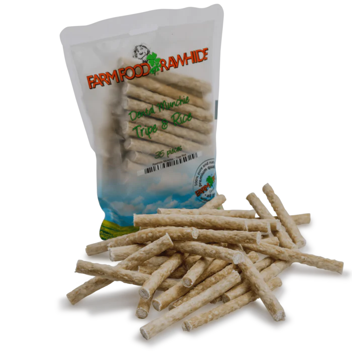 Farm Food Rawhide Dental Munchie sticks zijn een smakelijke snack voor uw hond/Doodle, gemaakt van gedroogd onderhuids bindweefsel. de Munchie sticks zijn gemaakt van bindweefsel, dat niet chemisch wordt behandeld en niet wordt gebleekt. Dit zorgt er voor dat uw hond op een gezonde manier het gebit kan reinigen en helpt afzettingen van tandplak en tandsteen te voorkomen.