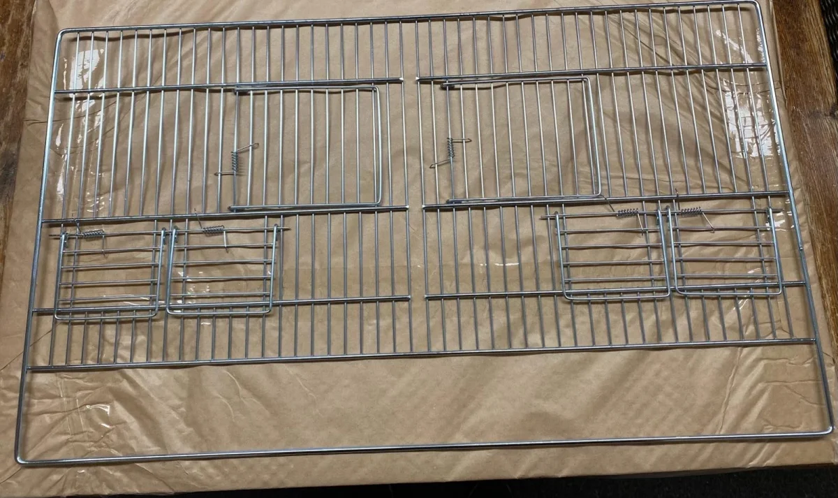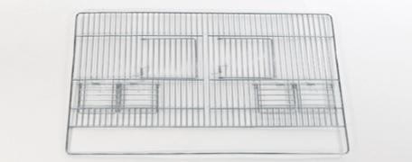 Gegalvaniseerd voorfront voor kooien 320/55 Domes, voorzien van 4 voerbakken. Dit voorfront is geschikt voor kooien van 55 cm en is vervaardigd door Domus Molinari in Italië. Afmetingen: hoogte 32 cm, breedte 55 cm.