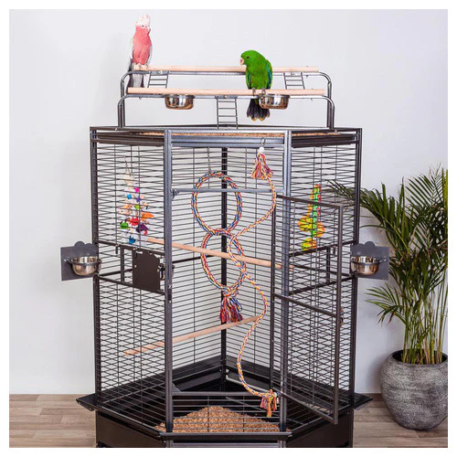 Deze vogelkooi is ideaal voor grasparkieten, valkparkieten en kleine papegaaiachtige vogels. Het wordt geleverd met de onderstaande accessoires: