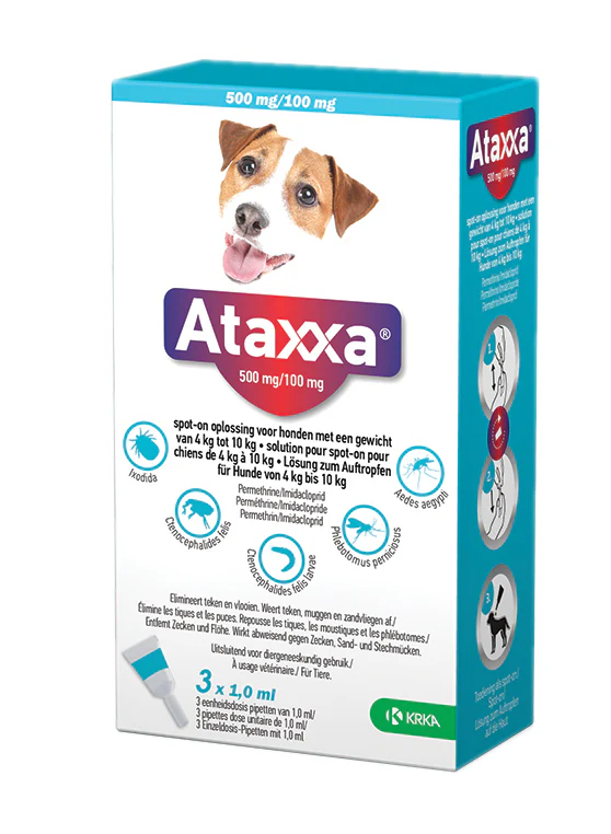 KRKA Ataxxa Spot On Hond 100 mg met 3 pipetten is een vlooienmiddel op basis van permethrine en Imidacloprid dat vlooien, vlooilarven en teken bestrijd bij honden tussen de 4 en 10 kg vanaf 7 weken, en een afwerende werking heeft tegen muggen en zandvliegen. Deze handige spot-on pipetten stellen jou in staat jouw dier eenvoudig te beschermen tegen parasieten. Dit middel werkt op basis van permethrine en imidacloprid, dat vlooien, vlooienlarven en teken bestrijdt, maar ook muggen en zandvliegen afweert om jouw dier nog beter te beschermen. Het middel werkt binnen één dag en de werking houdt vervolgens vier weken aan. Eenvoudig toe te dienen met druppels op de huid van de hond.