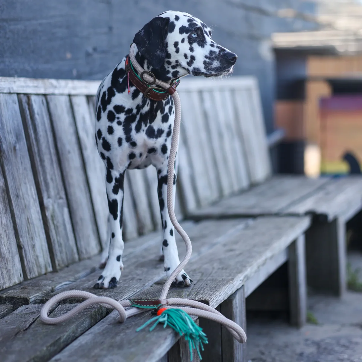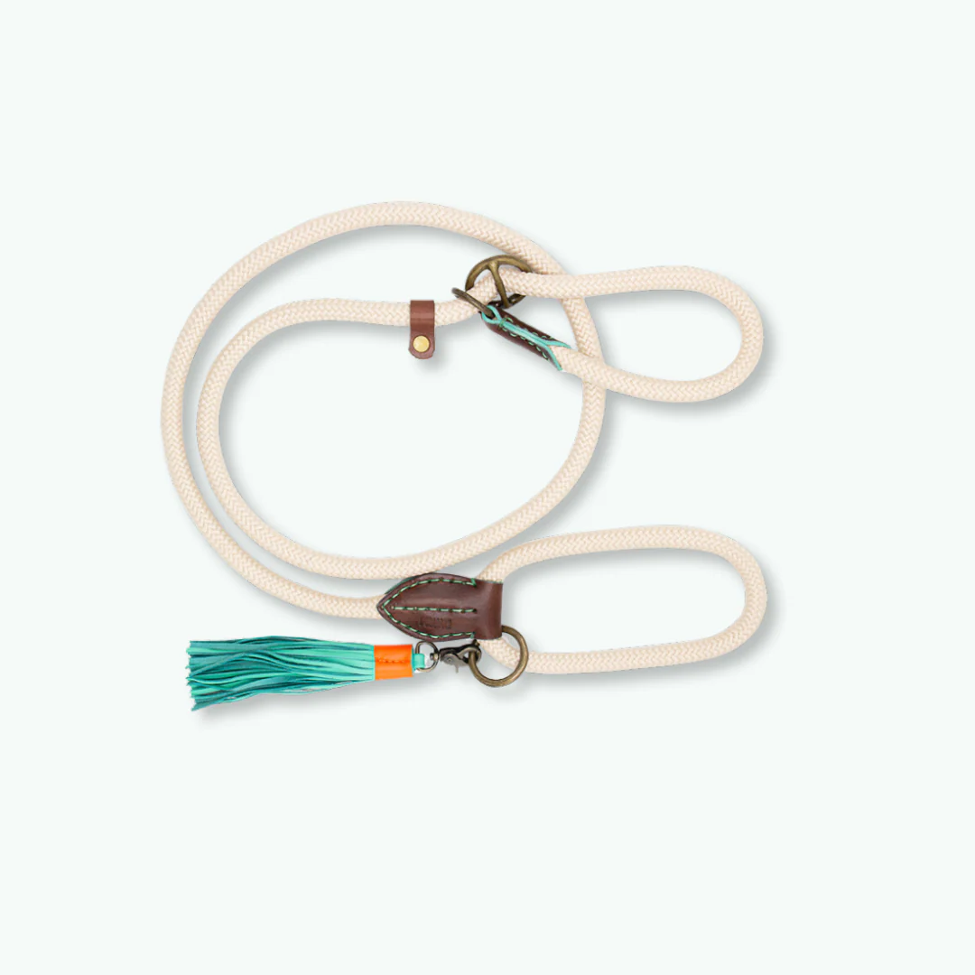 Zandkleurig, perfect voor elke dag en elke outfit. De Long John Sand slip lead is een stevige riem met handgestikte bruin leren details, en compleet afgemaakt met een vrolijk DWAM turquoise versiering.