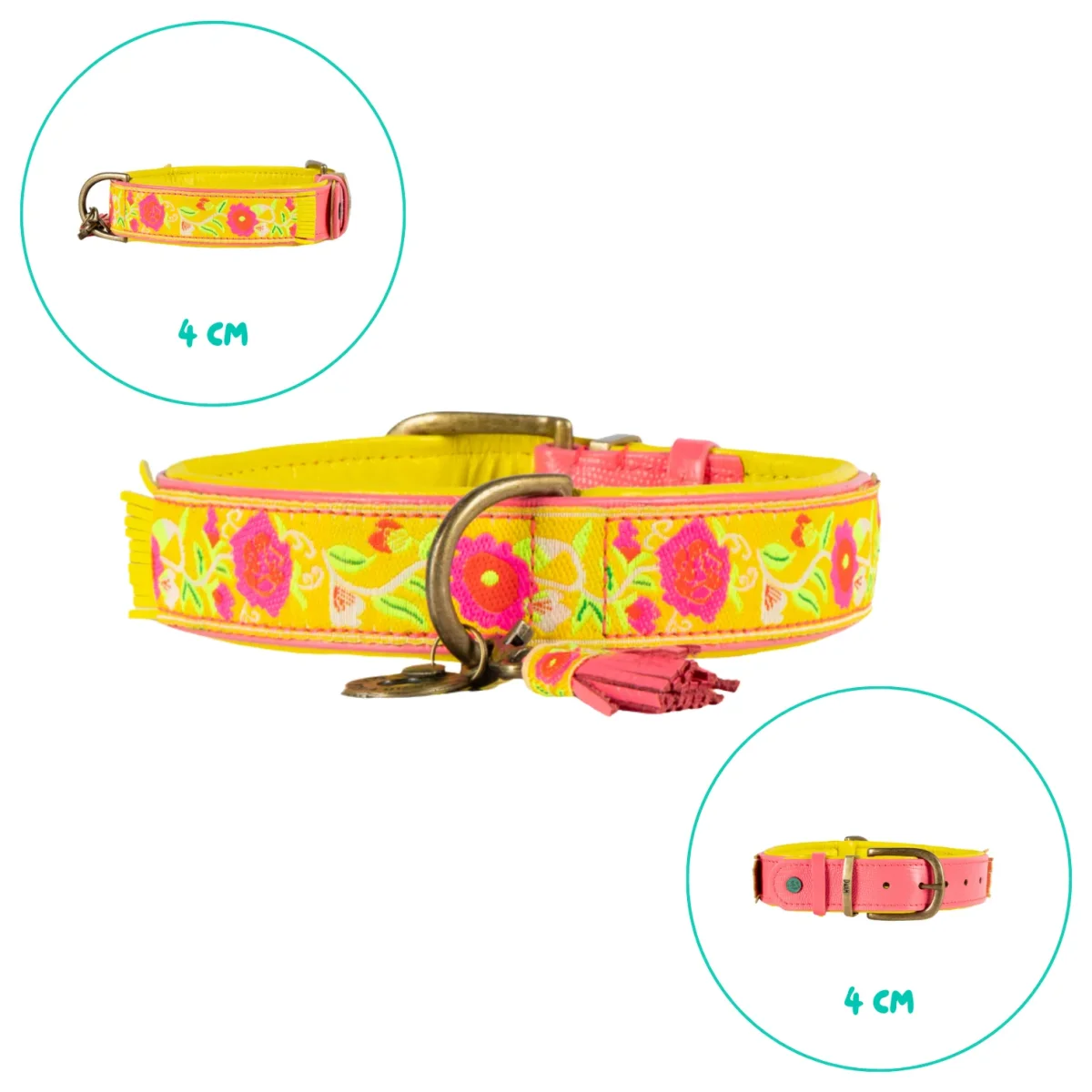Halsomvang: 48-57 cm (XL) | Breedte: 4 cm | Materiaal: Buffelleer met leren voering | Kleur: Geel leer met bloemenprint en roze kwastje | Hardware: Messing | Handgemaakt