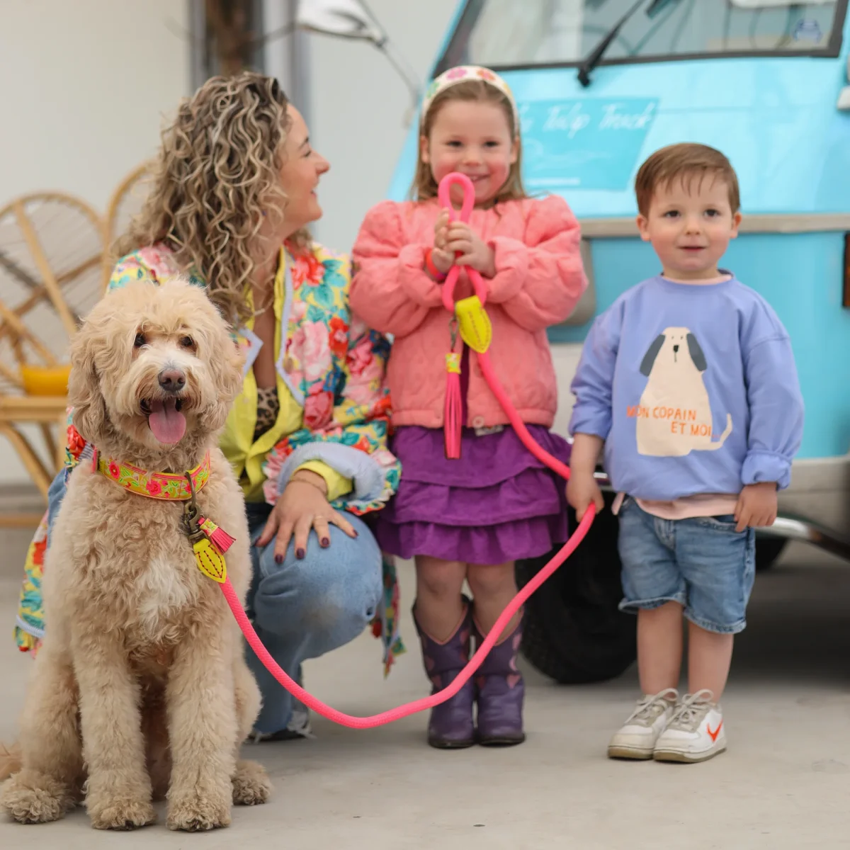 De Lotus halsband zorgt voor een frisse, opgewekte uitstraling die meteen in het oog springt. Deze handgemaakte halsband in maat XXS (halsomvang 22-24 cm, breedte 2 cm) is gemaakt van geel buffelleer met een vrolijke bloemenprint en een felroze leren kwastje. De gele binnenkant zorgt voor extra comfort en een luxe afwerking. Perfect voor kleine honden die opvallen met een zomerse look.