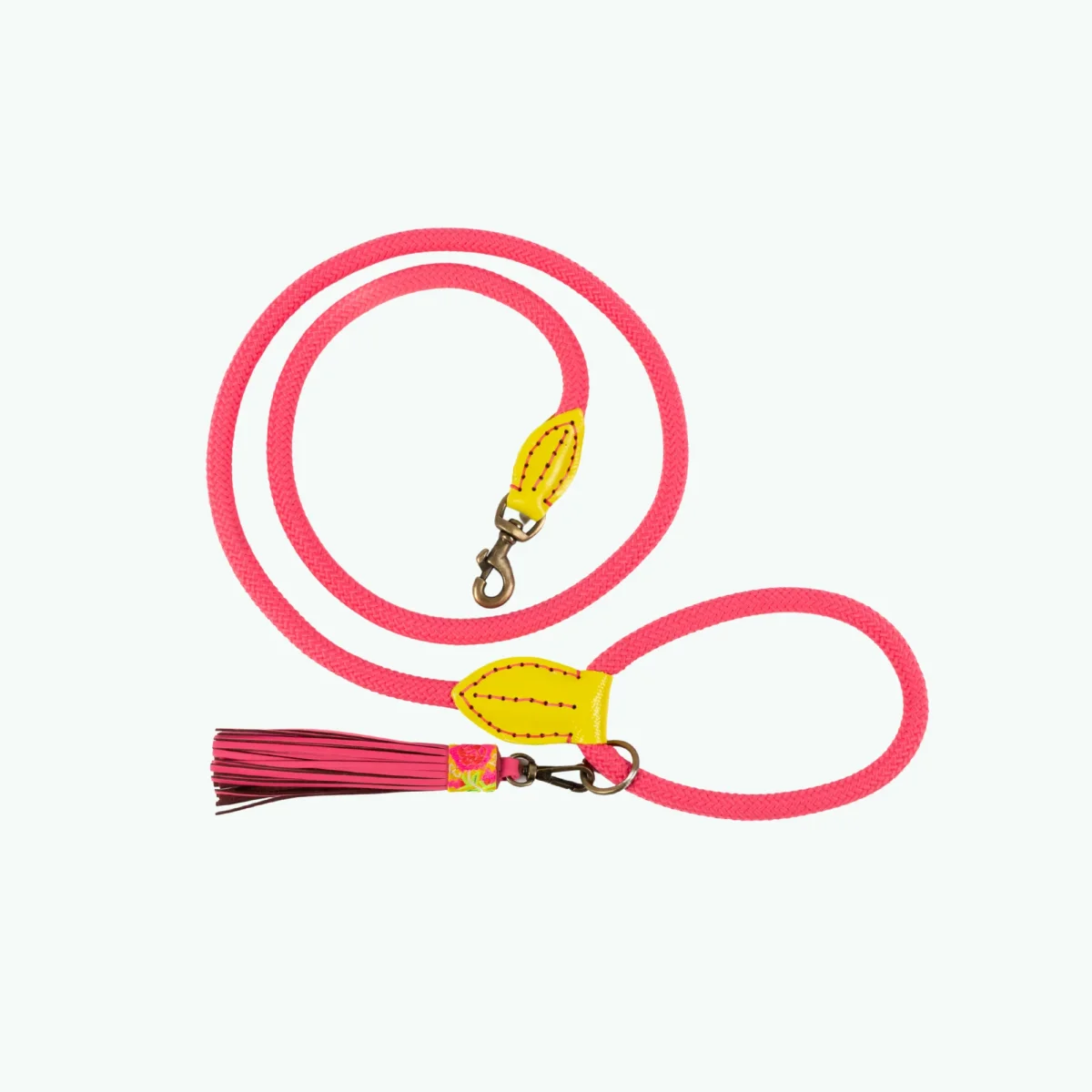 De riem is gemaakt van duurzaam canvas met een zonnige print en is afgewerkt met roze leerdetails en messing accenten. De comfortabele handlus zorgt voor een fijne grip en de karabijnhaak klik je makkelijk vast aan de halsband of het tuigje.