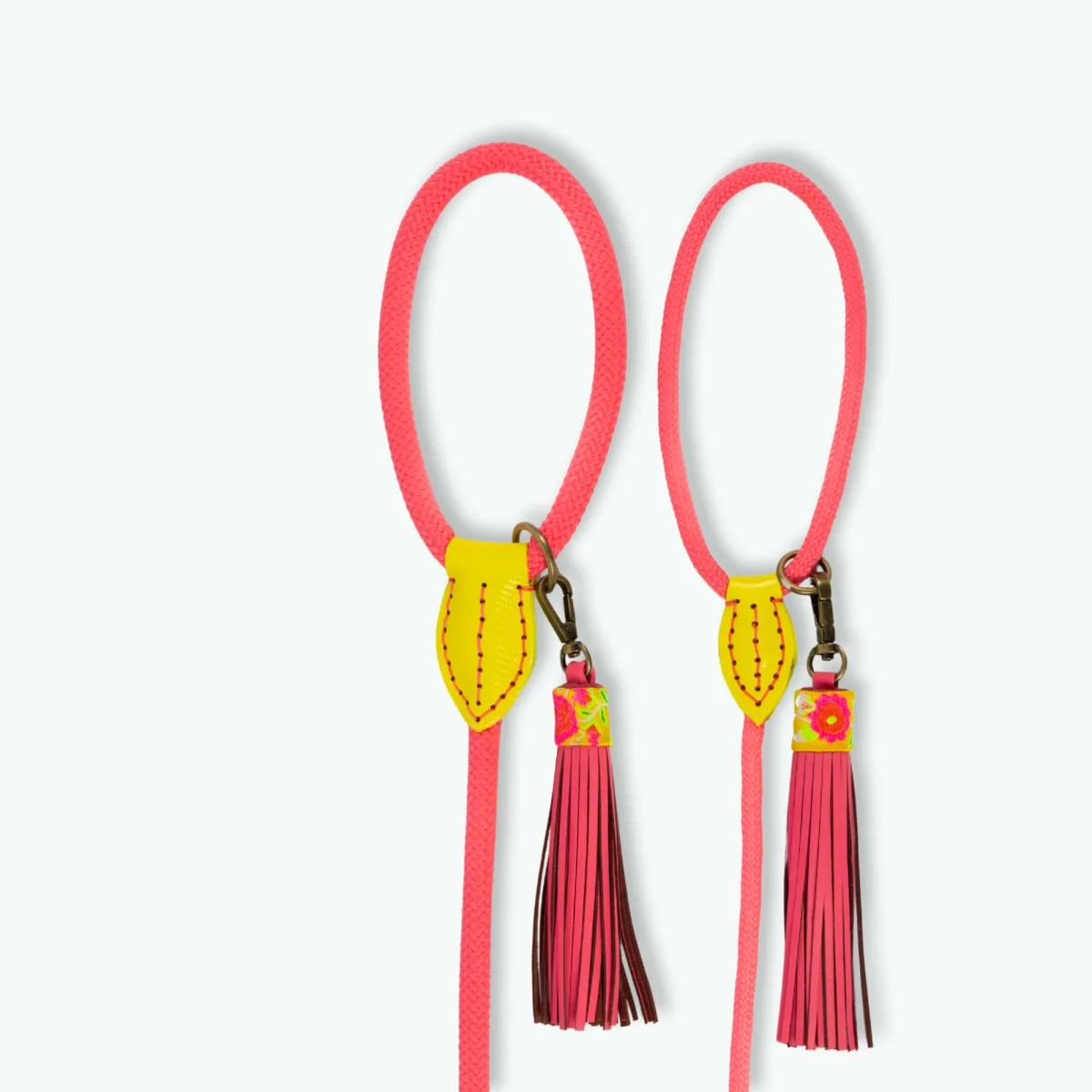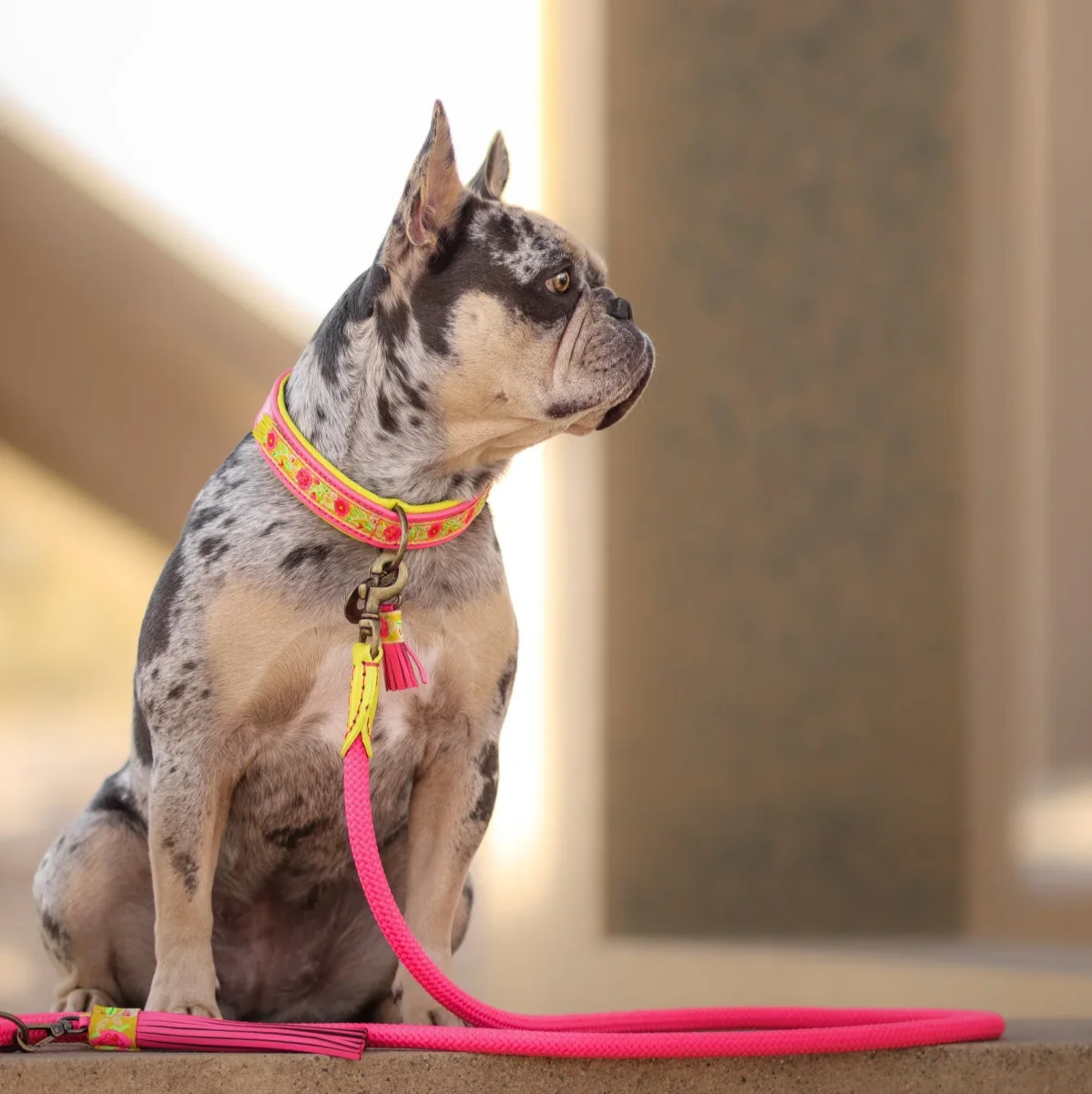 De riem is gemaakt van duurzaam canvas met een zonnige print en is afgewerkt met roze leerdetails en messing accenten. De comfortabele handlus zorgt voor een fijne grip en de karabijnhaak klik je makkelijk vast aan de halsband of het tuigje.