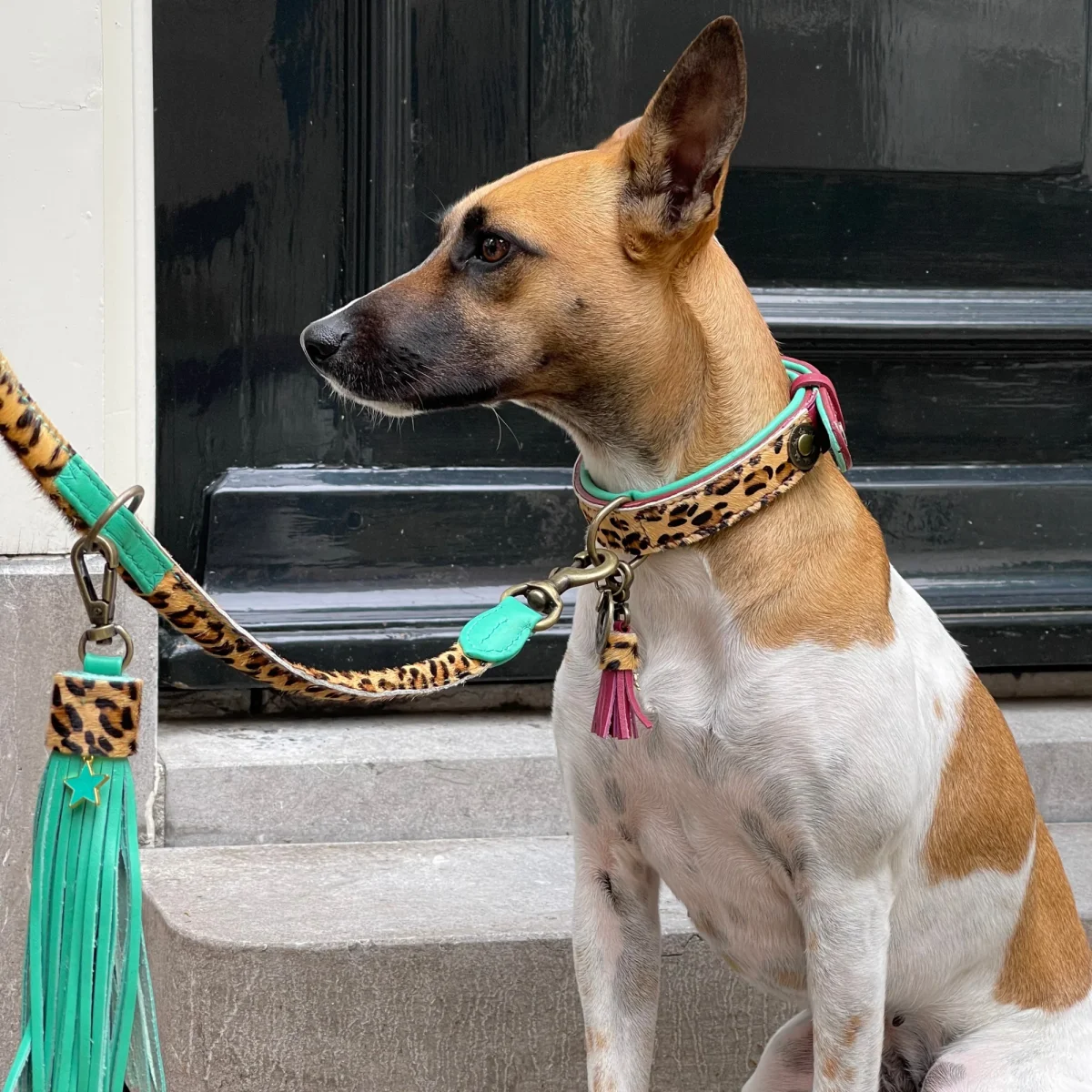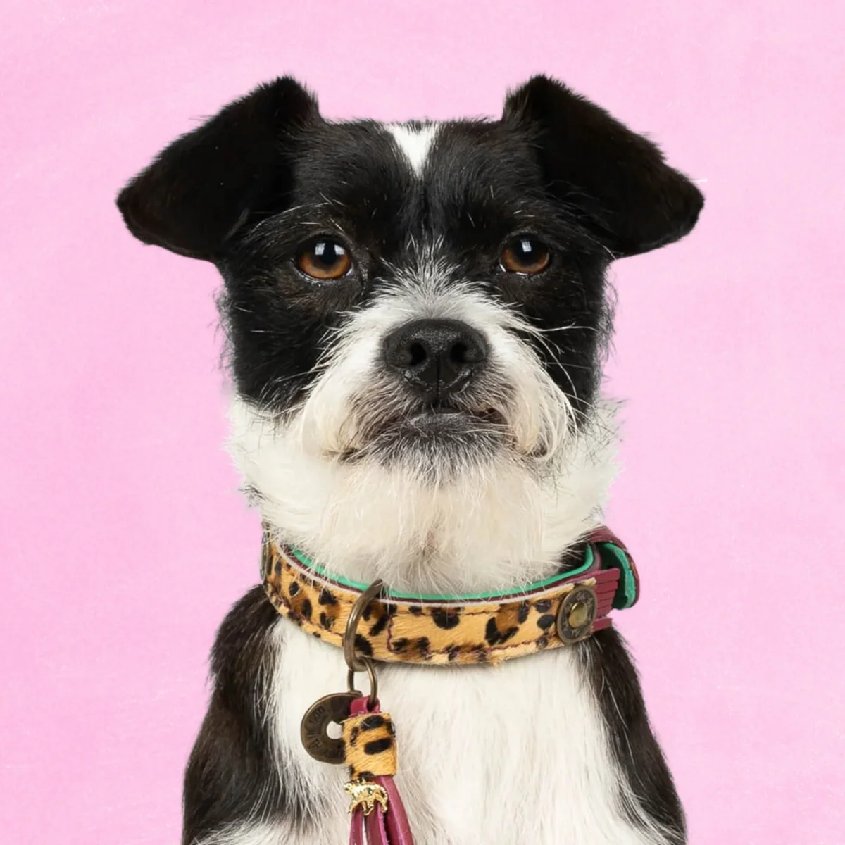 De Lou Lou halsband steelt de show met haar opvallende panterprint en geeft elke hond een speelse, gedurfde uitstraling. Deze handgemaakte halsband in maat S (halsomvang 30-33 cm, breedte 2 cm) is gemaakt van bordeauxrood buffelleer met dierenprint. De combinatie van bordeauxrood leer met de luxe dierenprint maakt deze halsband een echte eyecatcher. Perfect voor kleine honden die opvallen met een chique, elegante look.