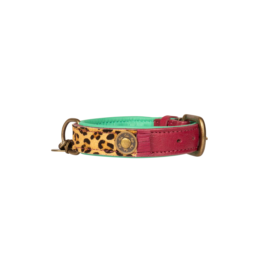 Halsomvang: 30-33 cm (S) | Breedte: 2,5 cm | Materiaal: Buffelleer | Kleur: Bordeauxrood leer met dierenprint | Hardware: Messing | Handgemaakt