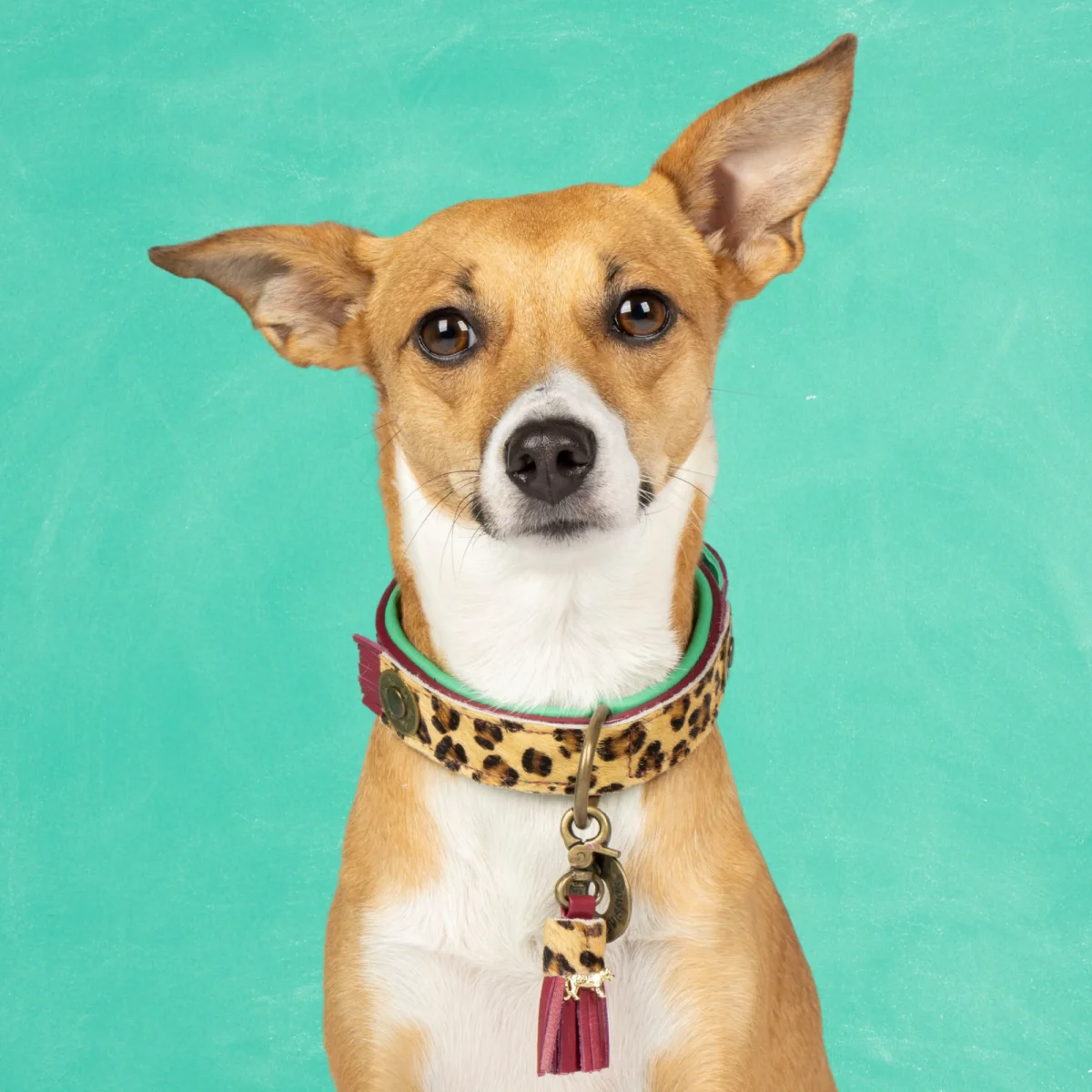 De Lou Lou halsband steelt de show met haar opvallende panterprint en geeft elke hond een speelse, gedurfde uitstraling. Deze handgemaakte halsband in maat S (halsomvang 30-33 cm, breedte 2,5 cm) is gemaakt van bordeauxrood buffelleer met dierenprint. De combinatie van bordeauxrood leer met de luxe dierenprint maakt deze halsband een echte eyecatcher. Perfect voor kleine honden die opvallen met een chique, elegante look.