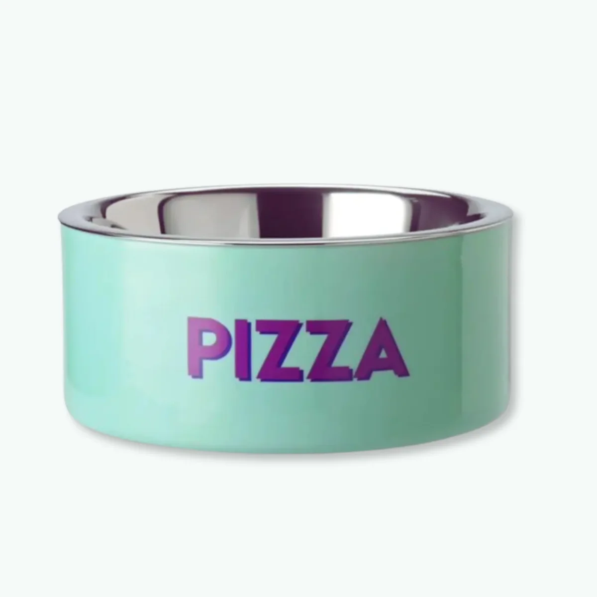 Stijlvolle hondenvoerbak van roestvrij staal met de grappige tekst “Pizza”.