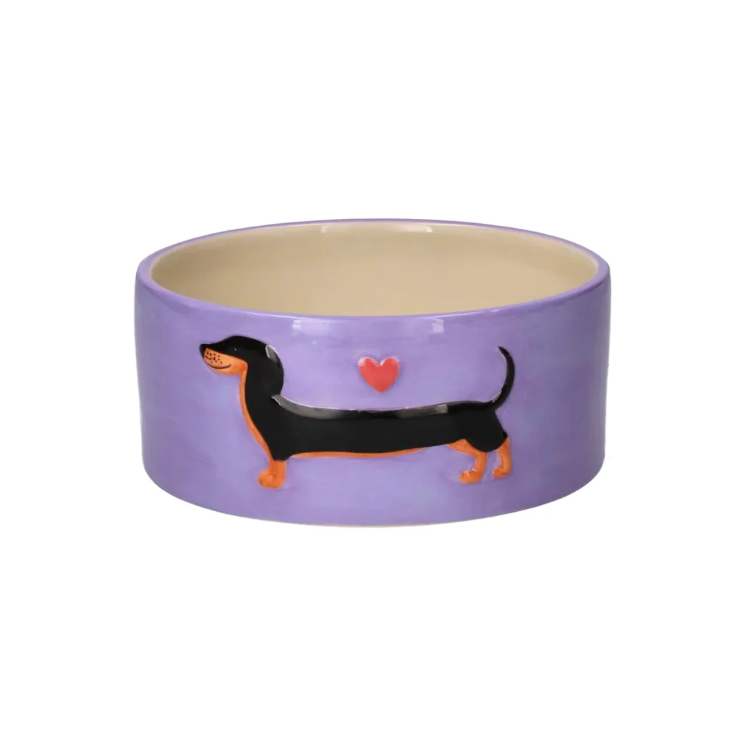 Deze paarse bowl met schattige teckel en hartje is onweerstaanbaar cute – maar wel op een stijlvolle manier. Perfect voor mini fashion icons.