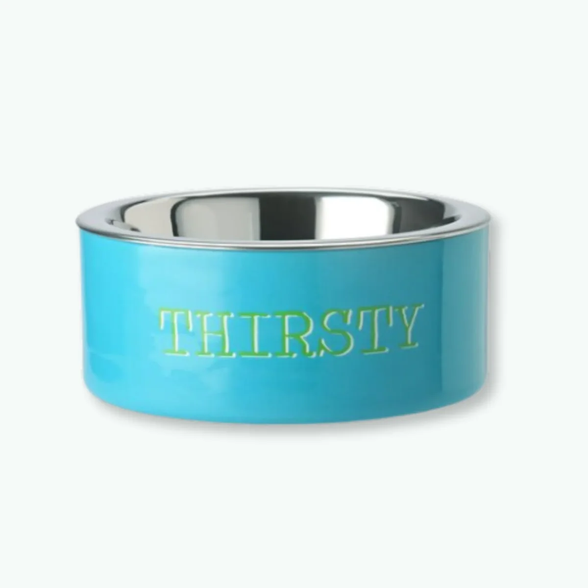 Stijlvolle hondenvoerbak van roestvrij staal met de grappige tekst “Thirsty”.