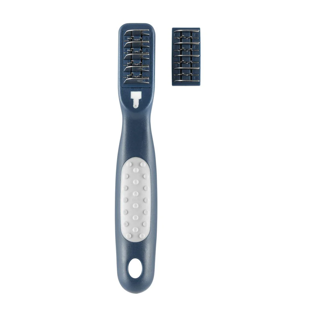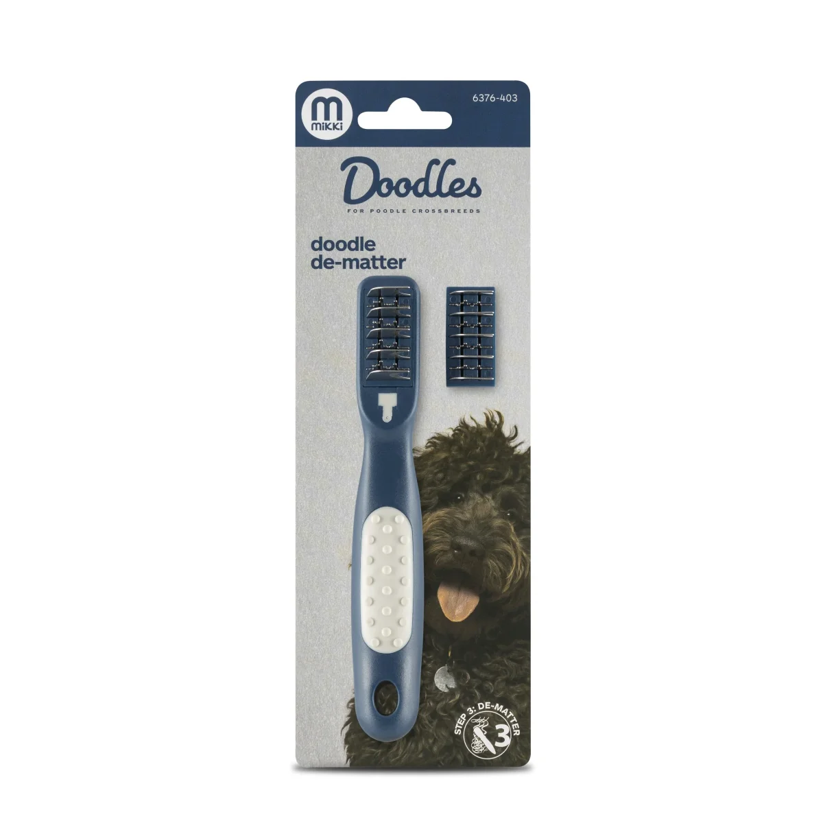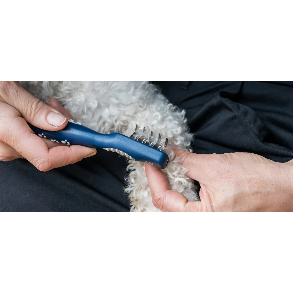 De Mikki Doodle De-Matter is de ideale tool om thuis de vacht van jouw doodle te onderhouden. Door elke dag de vacht vijf minuten te verzorgen, voorkom je vervilting en houdt je jouw huisdier schoon. Met deze De-Matter van Mikki heb je alles in huis om thuis de vacht goed te verzorgen! Heeft jouw doodle toch wat klitten die je er niet uit krijgt met kammen? De De-Matter van Mikki biedt dan een uitkomst. Houd het haar bij de wortel vast om te voorkomen dat het aan de huid trekt en gebruik korte bewegingen om voorzichtig door het geknoopte gebied te kammen. Neem voor klitten die groter zijn dan een erwt contact op met jouw trimmer in plaats van te proberen het zelf te ontwarren.