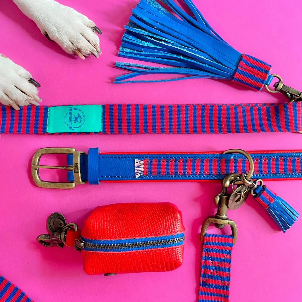 De Mr Clooney hondenhalsband brengt stijlvolle elegantie naar elke wandeling. Deze handgemaakte halsband in maat S (halsomvang 30-33 cm, breedte 2,5 cm) is gemaakt van blauw buffelleer met een rode leren voering aan de binnenkant. Over het blauwe leer zit een rood en blauw gestreepte geweven band. De combinatie van blauw en rood leer met de kleurrijke gestreepte band maakt deze halsband een echte eyecatcher. Perfect voor kleine honden die opvallen met een stijlvolle, klassieke look.