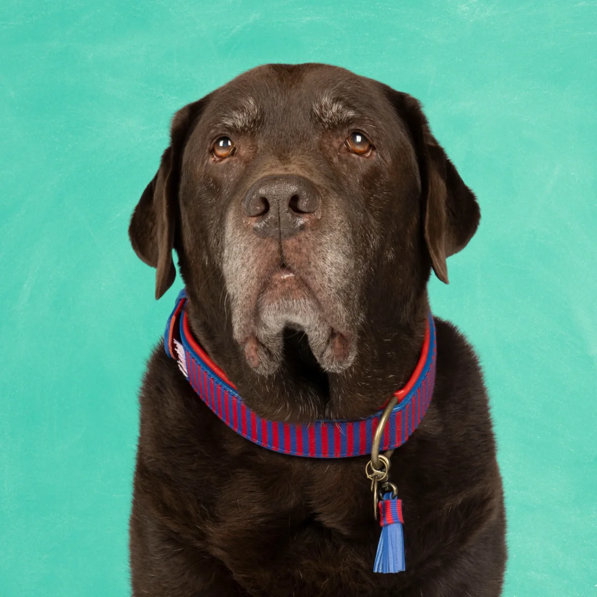 De Mr Clooney hondenhalsband brengt stijlvolle elegantie naar elke wandeling. Deze handgemaakte halsband in maat XXL (halsomvang 58-65 cm, breedte 4 cm) is gemaakt van blauw buffelleer met een rode leren voering aan de binnenkant. Over het blauwe leer zit een rood en blauw gestreepte geweven band. De combinatie van blauw en rood leer met de kleurrijke gestreepte band maakt deze halsband een echte eyecatcher. Perfect voor extra extra grote honden die opvallen met een stijlvolle, klassieke look.