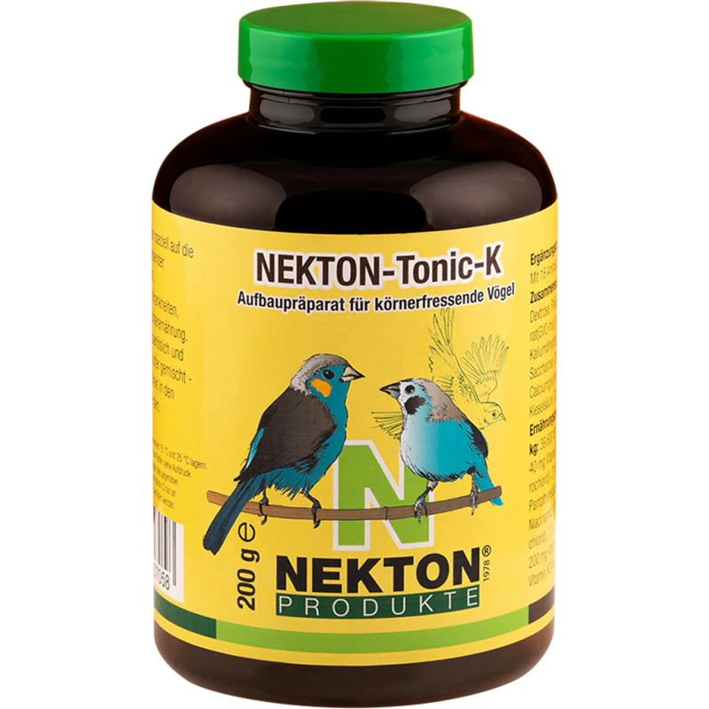 NEKTON-TONIC-K bestaat uit meer dan 60 verschillende afzonderlijke stoffen, waarvan de gezamenlijke werking een bijzonder uitgebalanceerd synthetisch en aanvullend voedingsmiddel oplevert. NEKTON-TONIC-K is ontwikkeld op basis van de meest recente wetenschappelijke kennis over de voedingsbehoeften van graanetende vogels.