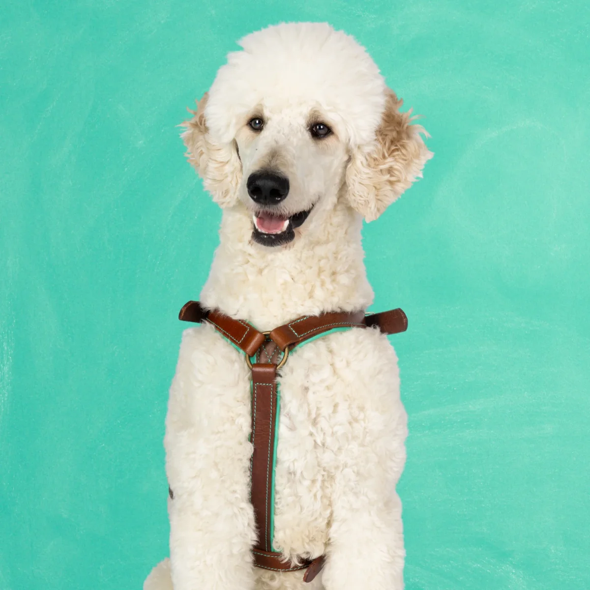 Het stoere Rock tuigje uit de Urban collectie is gemaakt voor de wildste avonturen. Sterk bruin leer van buiten, zacht DWAM turquoise leer van binnen. Stoer van buiten, zacht van binnen, net als jouw hond. En om hem compleet te maken is hij afgemaakt met gouden details, want jouw hond verdient niets minder.