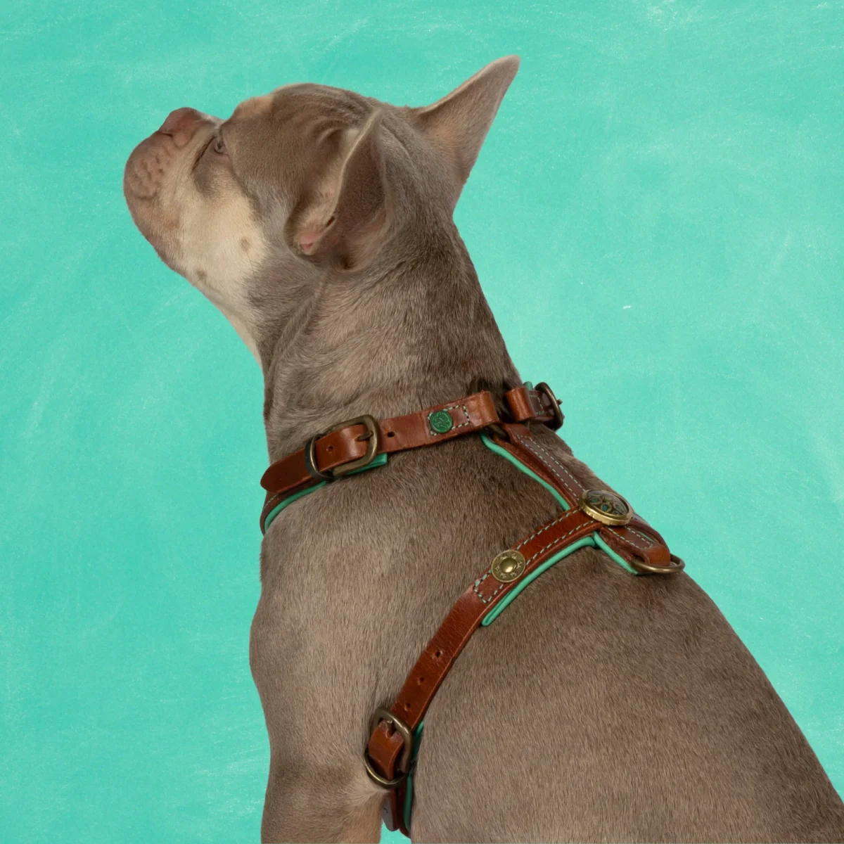 Het stoere Rock tuigje uit de Urban collectie is gemaakt voor de wildste avonturen. Sterk bruin leer van buiten, zacht DWAM turquoise leer van binnen. Stoer van buiten, zacht van binnen, net als jouw hond. En om hem compleet te maken is hij afgemaakt met gouden details, want jouw hond verdient niets minder.