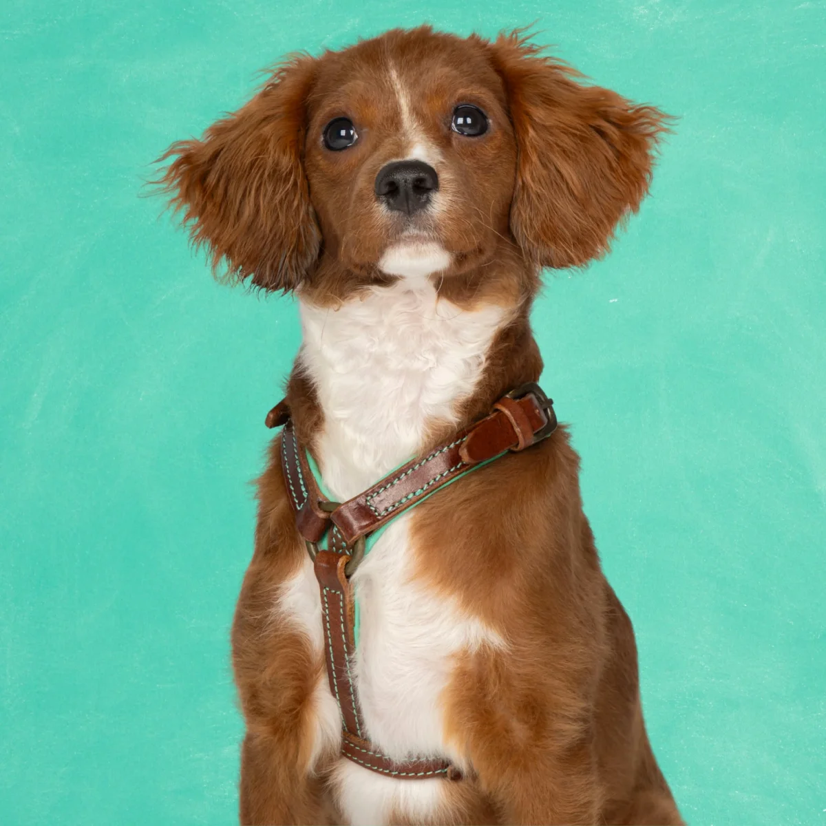 Het stoere Rock tuigje uit de Urban collectie is gemaakt voor de wildste avonturen. Sterk bruin leer van buiten, zacht DWAM turquoise leer van binnen. Stoer van buiten, zacht van binnen, net als jouw hond. En om hem compleet te maken is hij afgemaakt met gouden details, want jouw hond verdient niets minder.