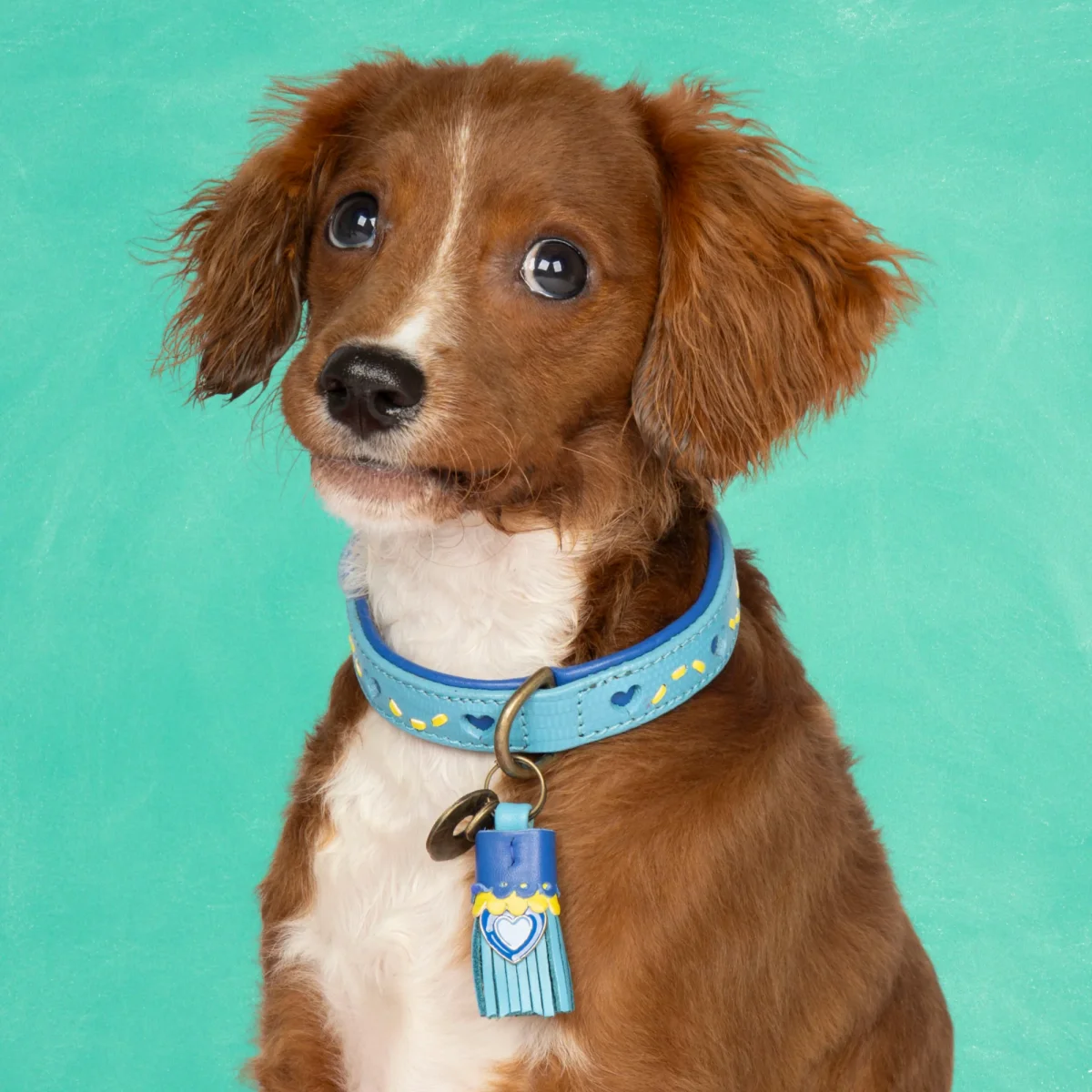 De Sky halsband geeft elke hond een speelse en frisse look met haar vrolijke hartjes en charmante details. Deze handgemaakte halsband in maat XS (halsomvang 25-29 cm, breedte 2 cm) is gemaakt van lichtblauw buffelleer met uitgesneden hartjes en gele stiksels. De combinatie van lichtblauw leer met de speelse hartjes en gele stiksels maakt deze halsband een echte eyecatcher. Perfect voor kleine honden die opvallen met een lieve, speelse look.