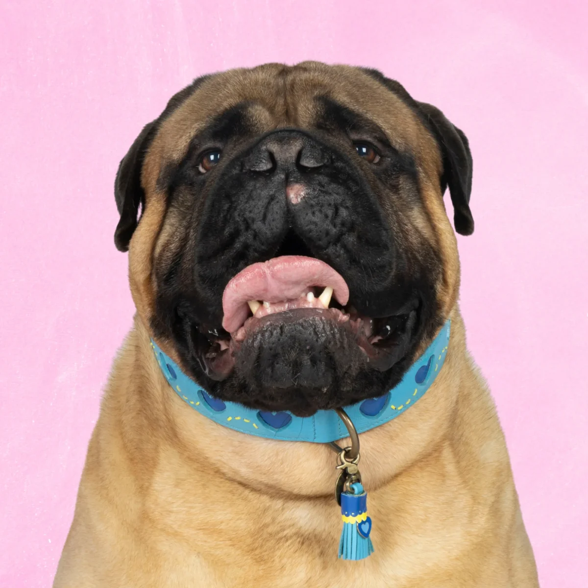 Halsomvang: 58-65 cm (XXL) | Breedte: 4 cm | Materiaal: Buffelleer | Kleur: Lichtblauw leer met uitgesneden hartjes en gele stiksels | Hardware: Messing | Handgemaakt