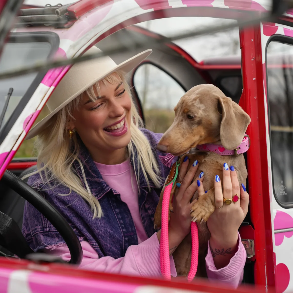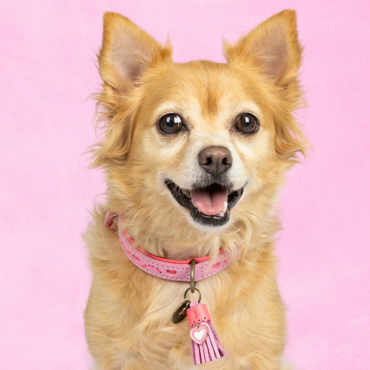 Halsomvang: 30-33 cm (S) | Breedte: 2 cm | Materiaal: Buffelleer | Kleur: Roze leer met uitgesneden hartjes | Hardware: Messing | Handgemaakt