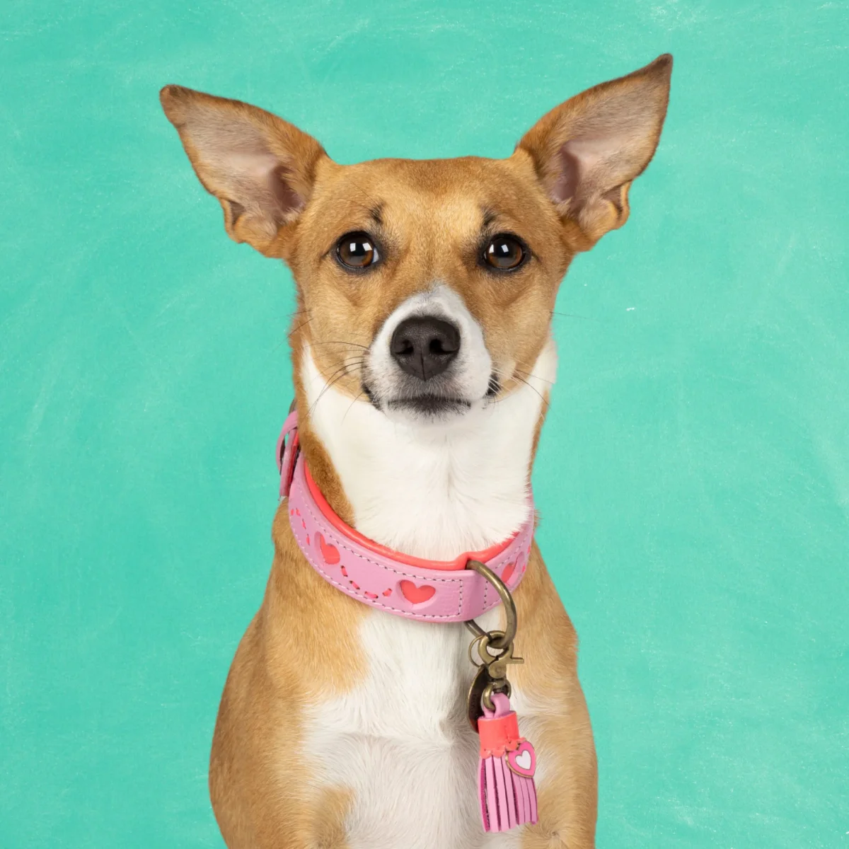 Halsomvang: 30-33 cm (S) | Breedte: 2,5 cm | Materiaal: Buffelleer | Kleur: Roze leer met uitgesneden hartjes | Hardware: Messing | Handgemaakt